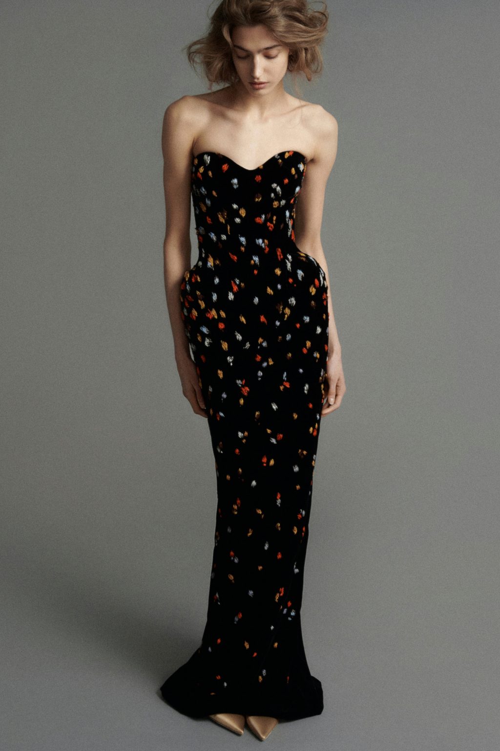 Декор в коллекции лишен избыточной театральности — он интегрирован в конструкцию. В платье-колонне из шелкового бархата матовые нити и канитель создают мягкое, рассеянное свечение, избегая привычной для Дома декоративной насыщенности бисером.
