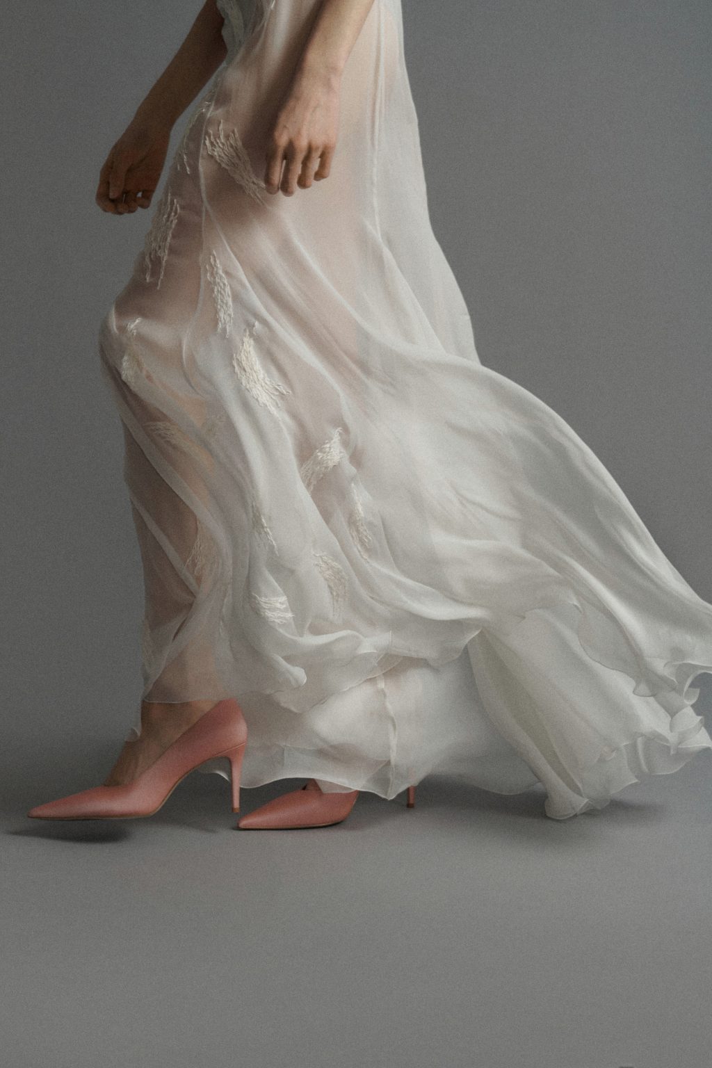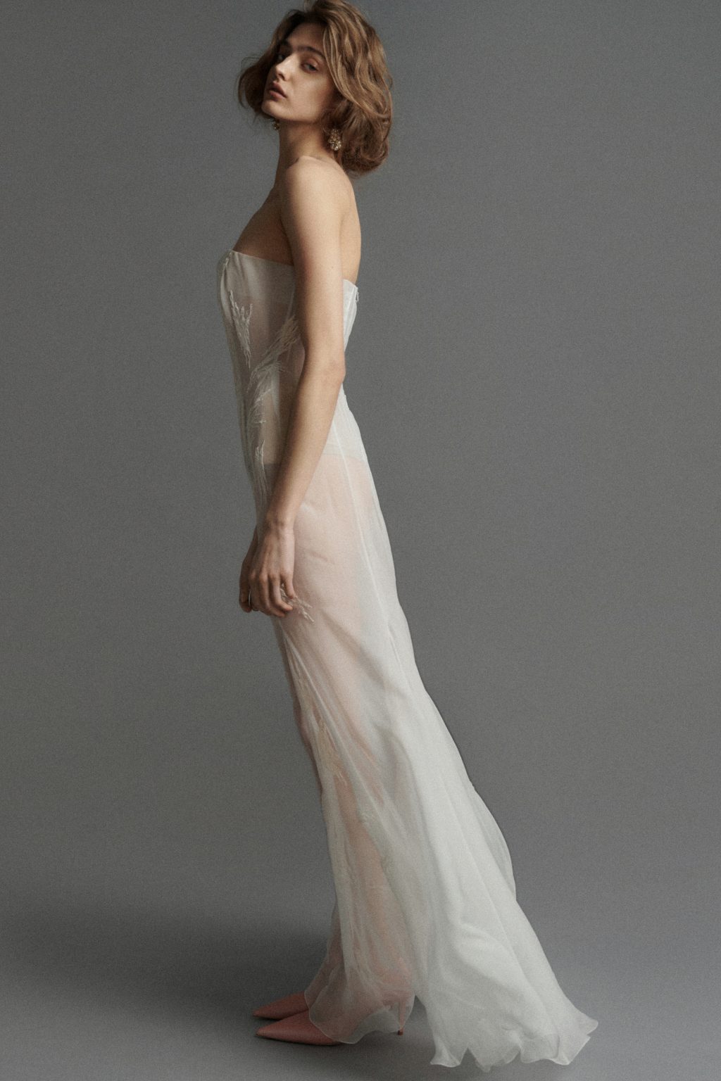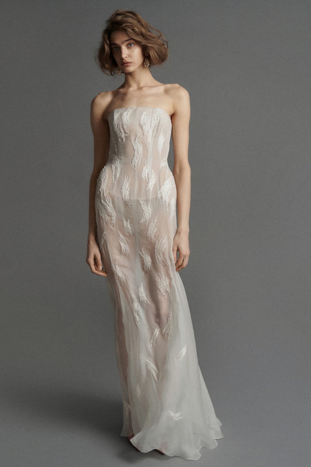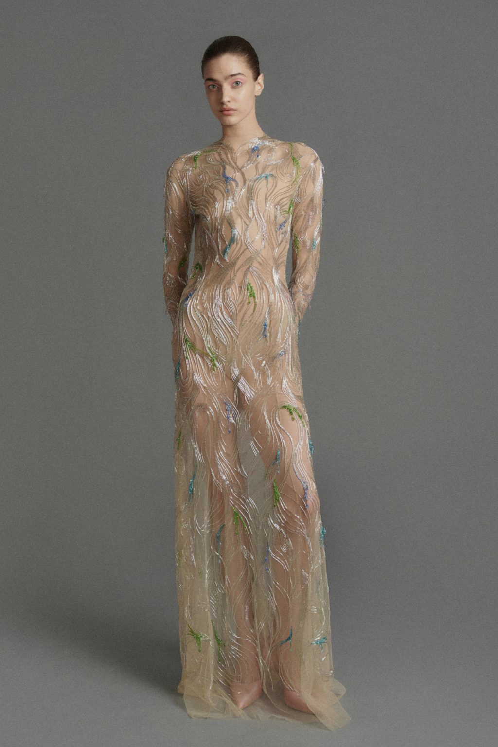 Особое место занимает полупрозрачное платье из креп-шифона жемчужного оттенка, вдохновленное живописью школы Фонтенбло. Образ Поппеи Сабины, скрытой под легкой вуалью, трансформируется в современную кутюрную интерпретацию: ткань растворяется, оставляя лишь ощущение дымки.