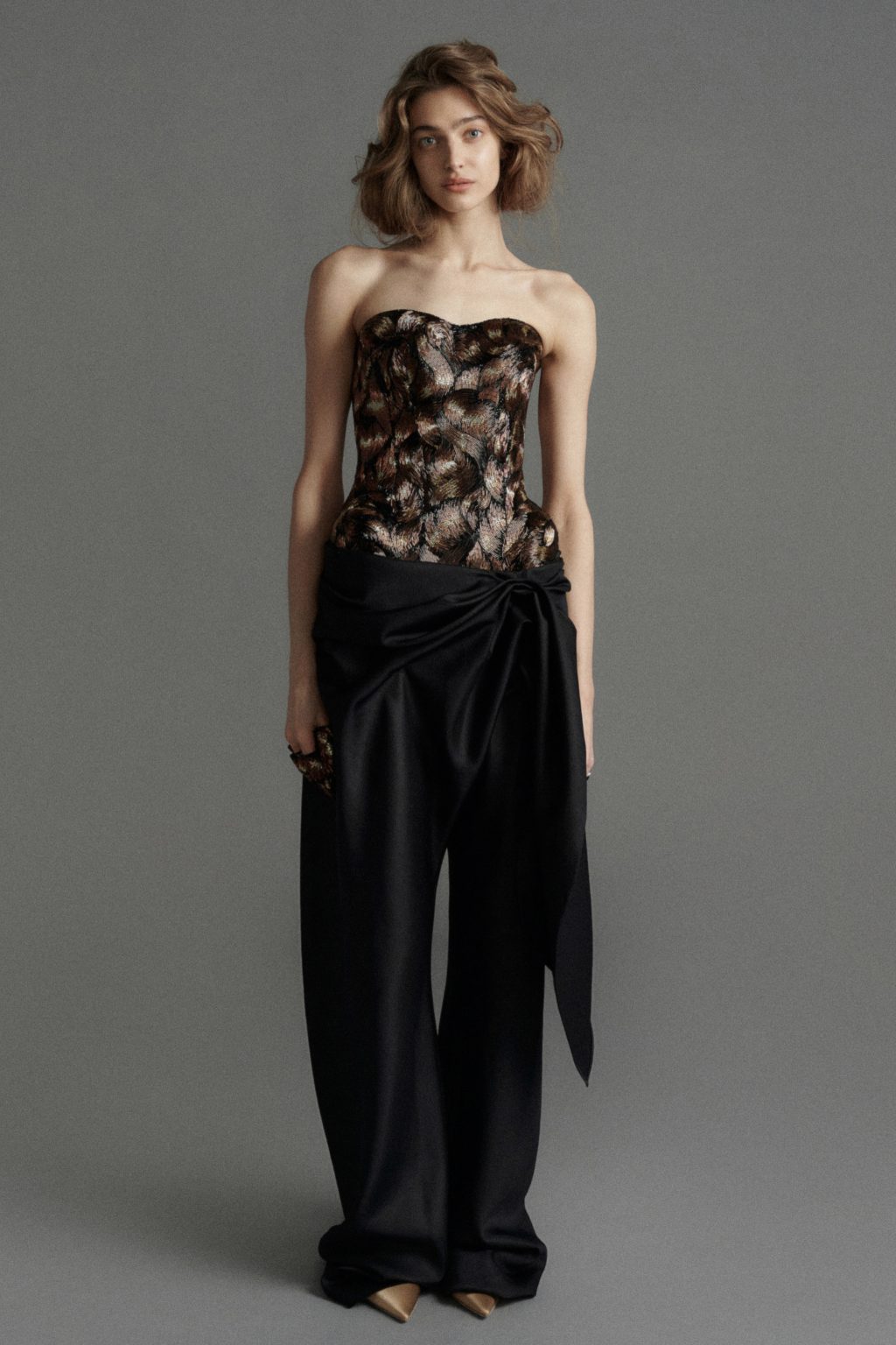 В центре — форма. Вытянутые силуэты, колонна, «рыбка», корсетная линия — все подчинено идее вертикали и пластики тела. Архитектоника вещей становится главным выразительным инструментом: линия плеча, ритм бедер, точность пропорций работают как элементы графики.