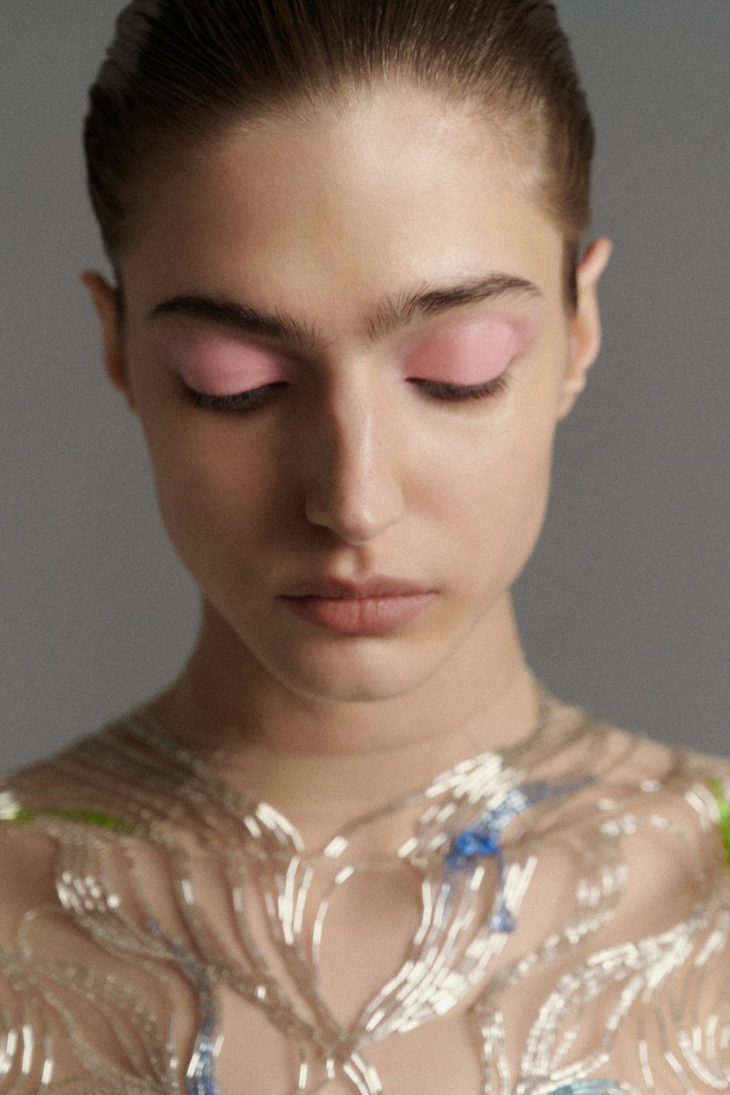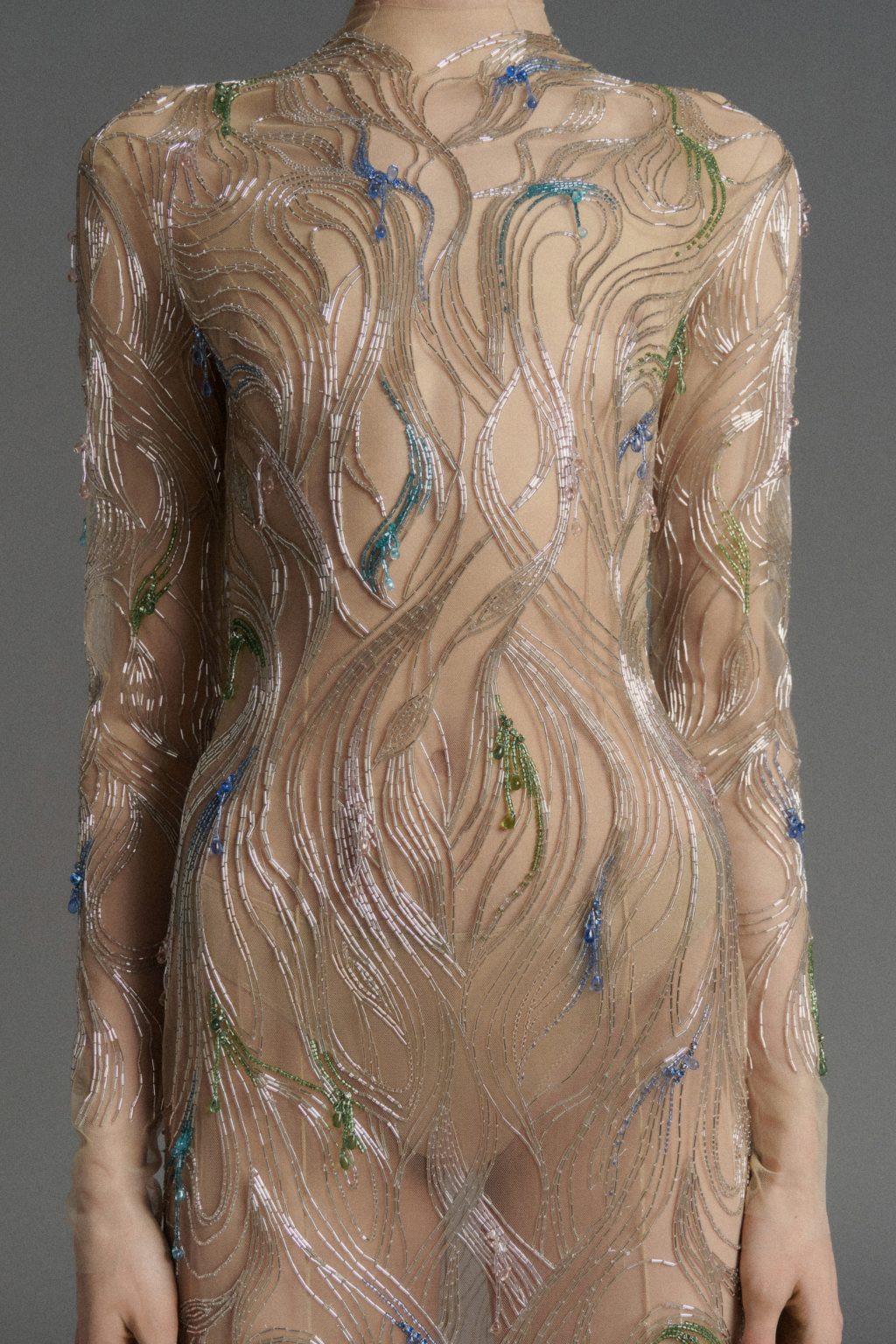 В «голом» платье из телесной сетки этот эффект доведен до предела — остается только структура вышивки, словно графический след на теле.