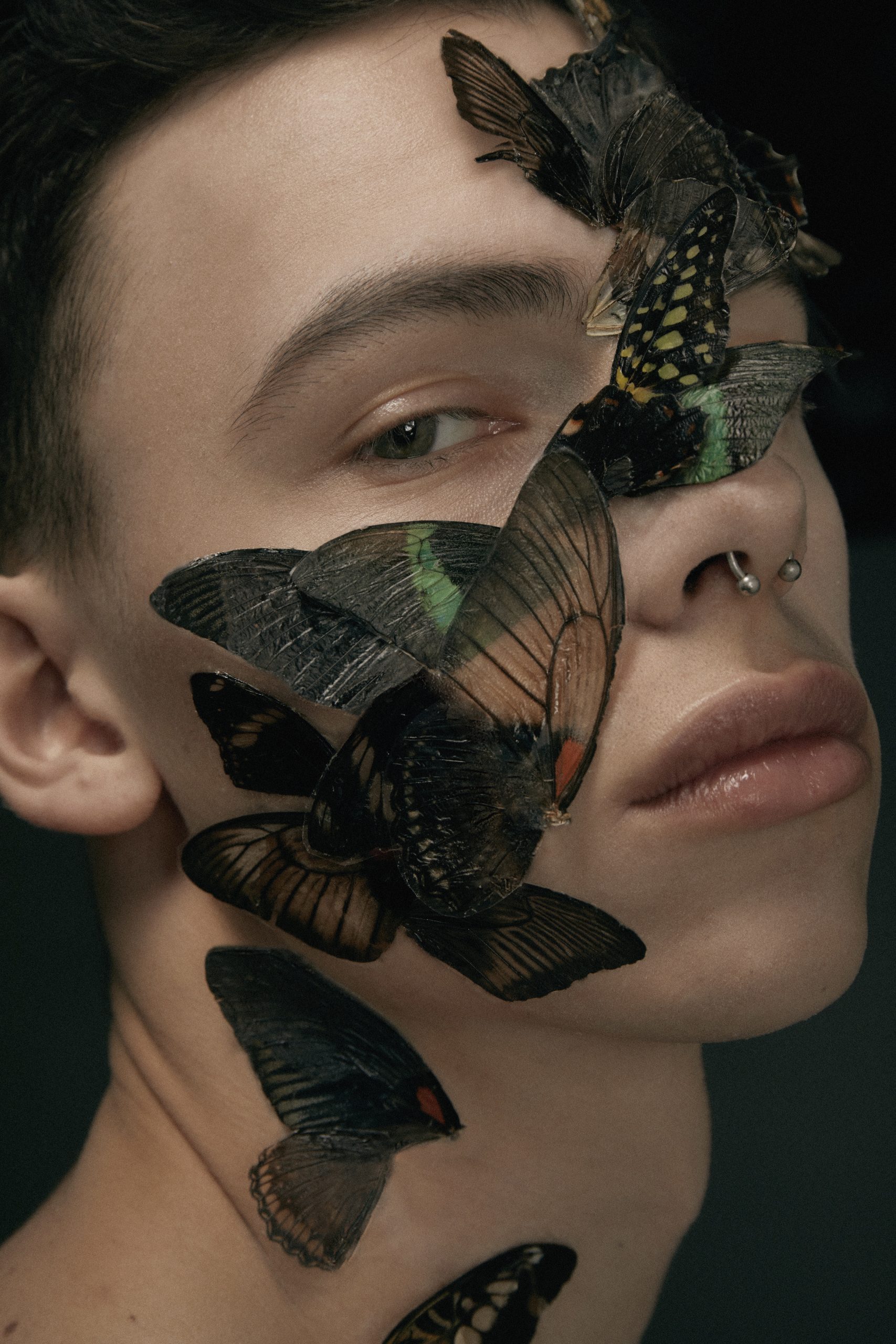 Одна из самых запоминающихся и любимых съемок была с бабочками. По сути, я сыграла тут роль продюсера: сама нашла модель, а на Авито отыскала продавца крыльев бабочек — да-да, они там есть! В дождь поехала за ними, ночью аккуратно подбирала крылышко к крылышку, делала коллаж, чтобы понять, как лучше их расположить. Главное испытание — сделать так, чтобы эти хрупкие крылышки выдержали на лице модели. Вечером перед съемкой я пыталась укрепить их с помощью клея.