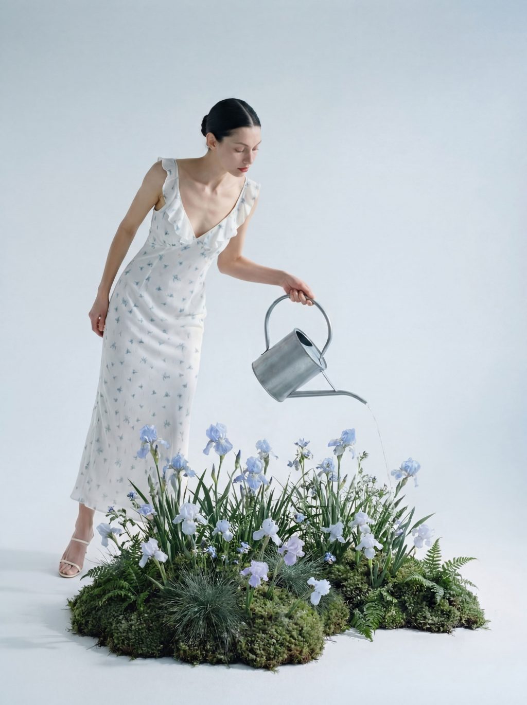 Ключевую роль играют авторские принты, выстроенные как визуальные истории пробуждения: от почти невидимых, акварельных намеков на цветение до более насыщенных, живых мотивов. Белые и голубые оттенки плавно перетекают друг в друга, создавая ощущение воздуха и света, словно весеннее небо, размытое облаками. Лаконичные силуэты соединяют невесомый шифон и структурный твид — контраст, в котором рождается современная женственность: свободная, но собранная, легкая, но с внутренним стержнем.