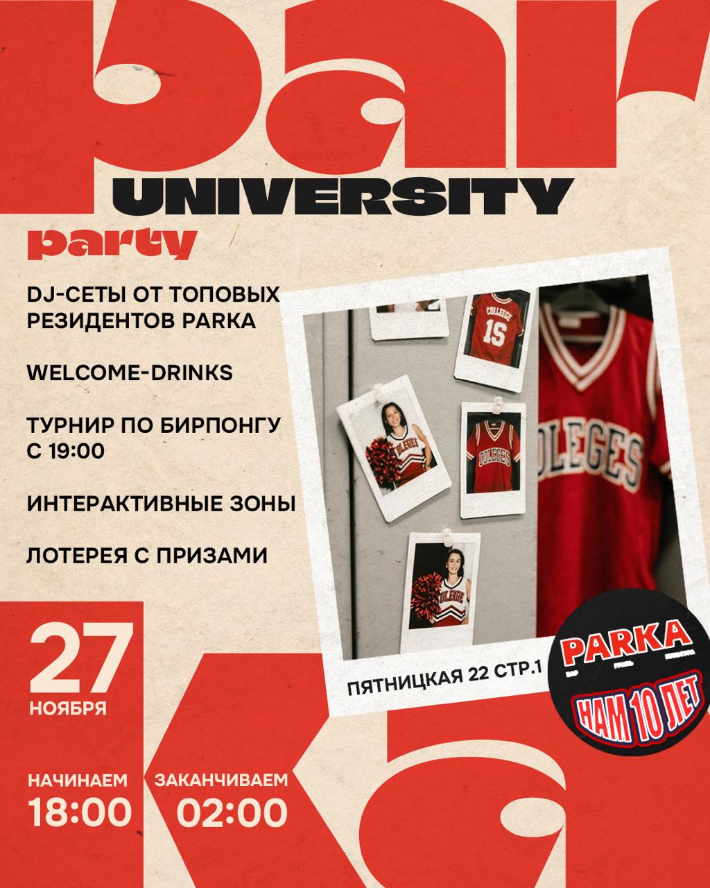 27 ноября, с 18:00 до 2:00 Parka на Пятницкой приглашает на Американскую университетскую вечеринку в честь 10-летия бара!