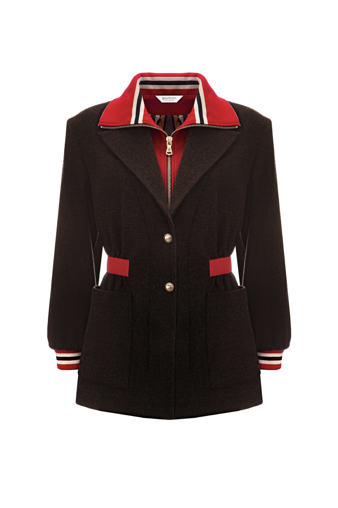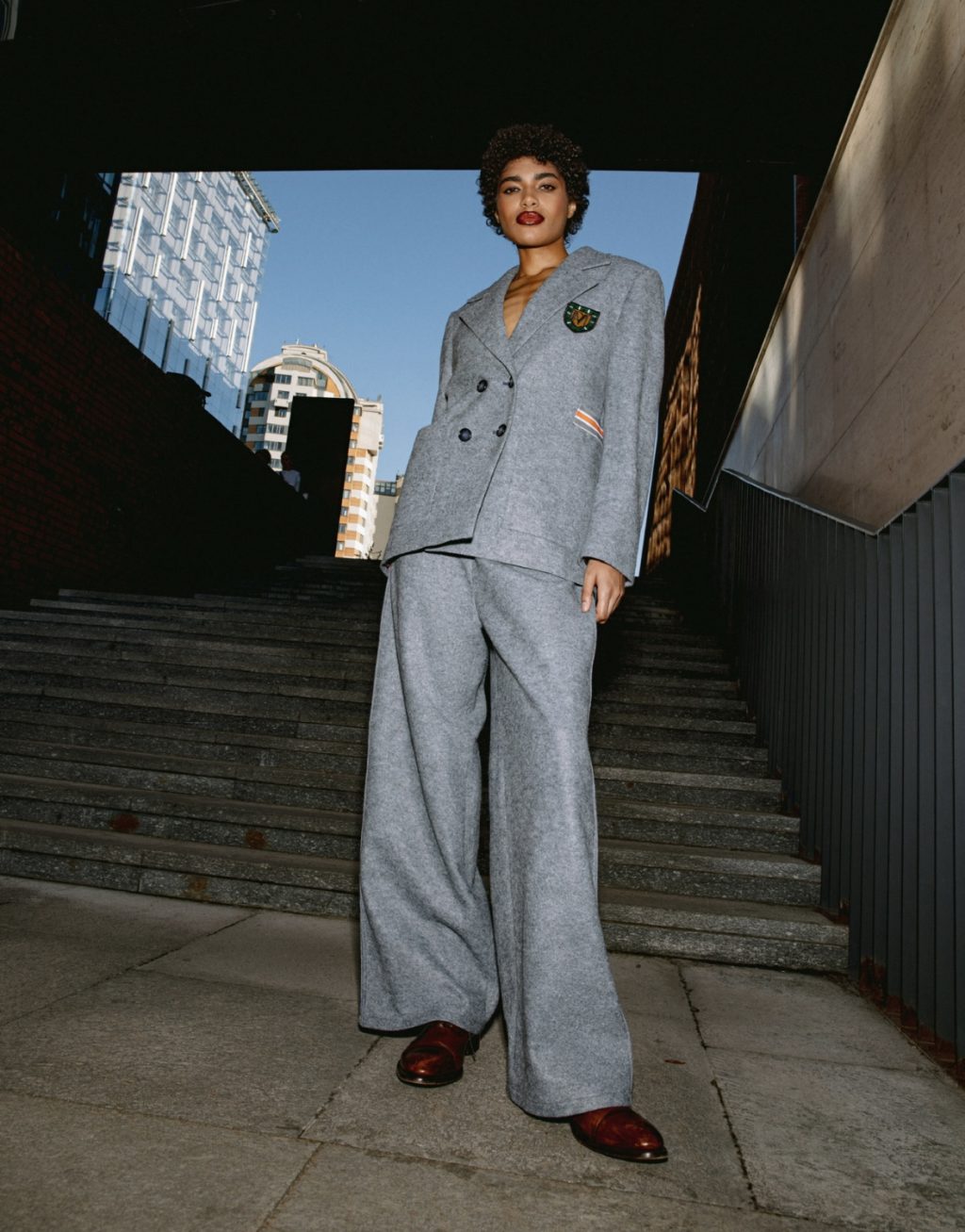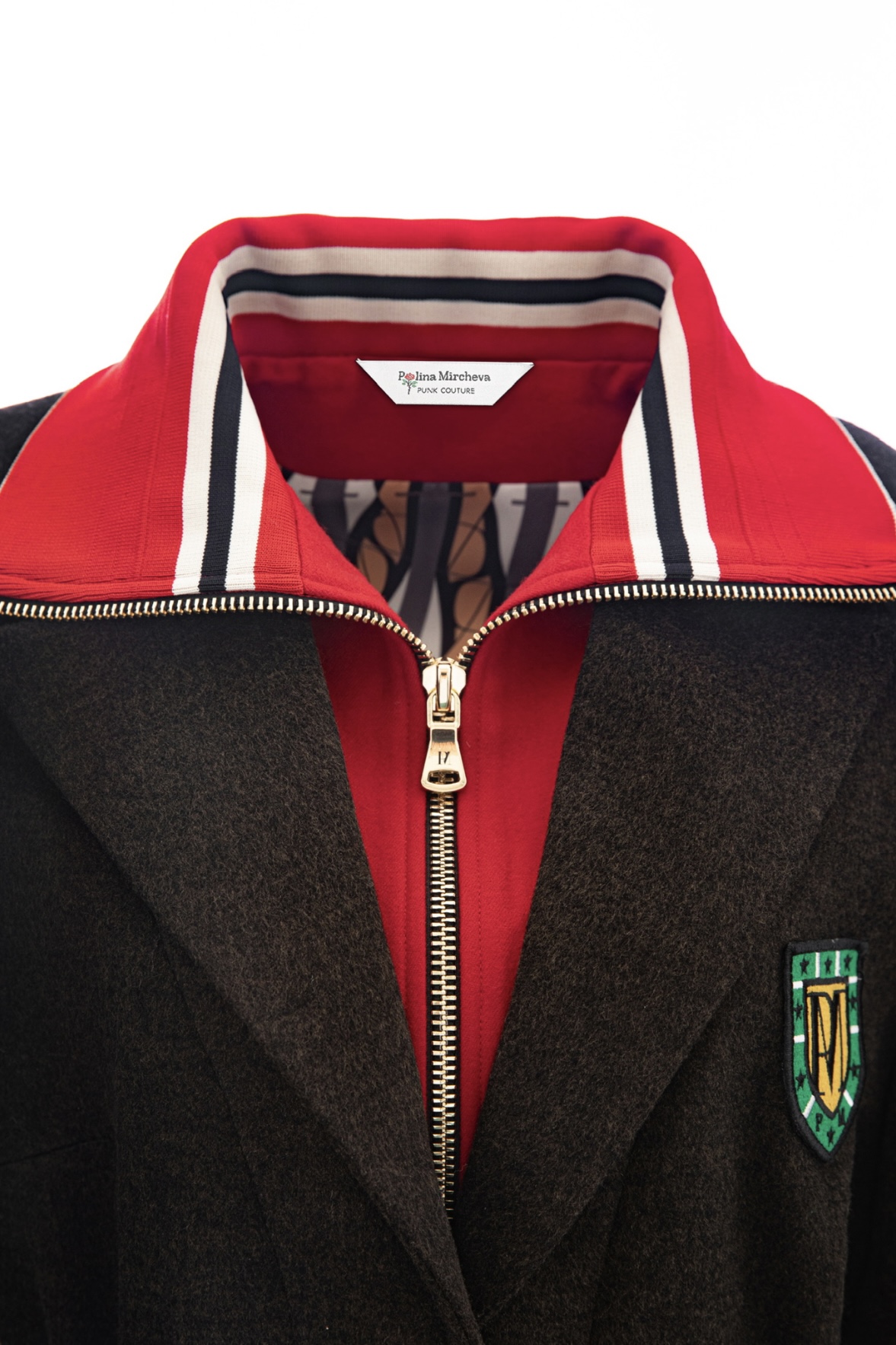 Коллекция мастерски сочетает шерстяные костюмы с элементами спортивного кроя и дизайна: вышитые шевроны, контрастные строчки, яркие резинки на талии и фирменная фурнитура делают каждую вещь узнаваемой и уникальной. Спортивные костюмы представлены в разнообразных тканях — от хлопка с жатым эффектом до благородного атласа цвета «пыльная слива». Особое внимание заслуживает костюм со съёмной юбкой-баской, который трансформирует спортивный образ в женственный и игривый.