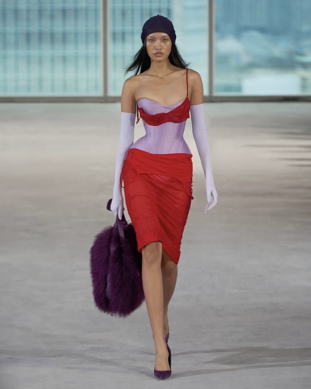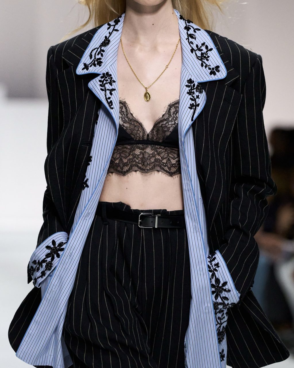 Если внимательно посмотреть на подиумы последних сезонов, этот сдвиг становится очевидным. У Saint Laurent — бра-топы под строгими смокингами и прозрачные слои, создающие напряжение без избыточного декора. У Dolce & Gabbana — корсетная конструкция и кружево, встроенные в повседневный силуэт, а не вынесенные в категорию «вечернего костюма». У Miu Miu — видимая бретель и бельевые пропорции как интеллектуальный жест. Даже Versace, исторически ассоциирующийся с гламурным блеском, смещает акцент в сторону структуры, тела и контролируемой чувственности.