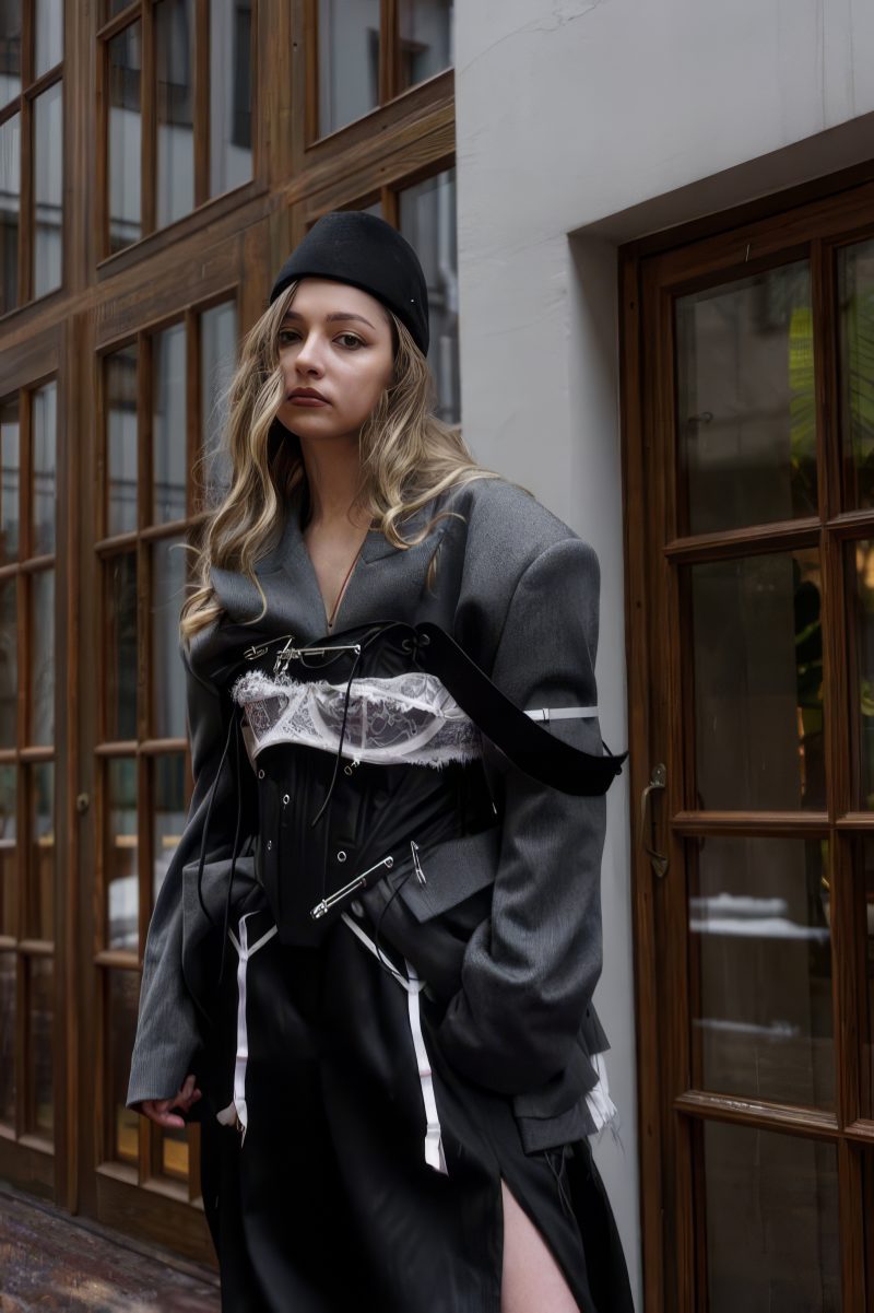 Важно, чтобы белье не было «одиноко». Его обязательно поддерживают фактуры, аксессуары, контрастные элементы. Если вы показываете бретель — добавьте массивные украшения. Если надеваете корсет — уравновесьте его мужским кроем или грубой обувью. Именно в этом напряжении рождается изысканность, а не провокация.