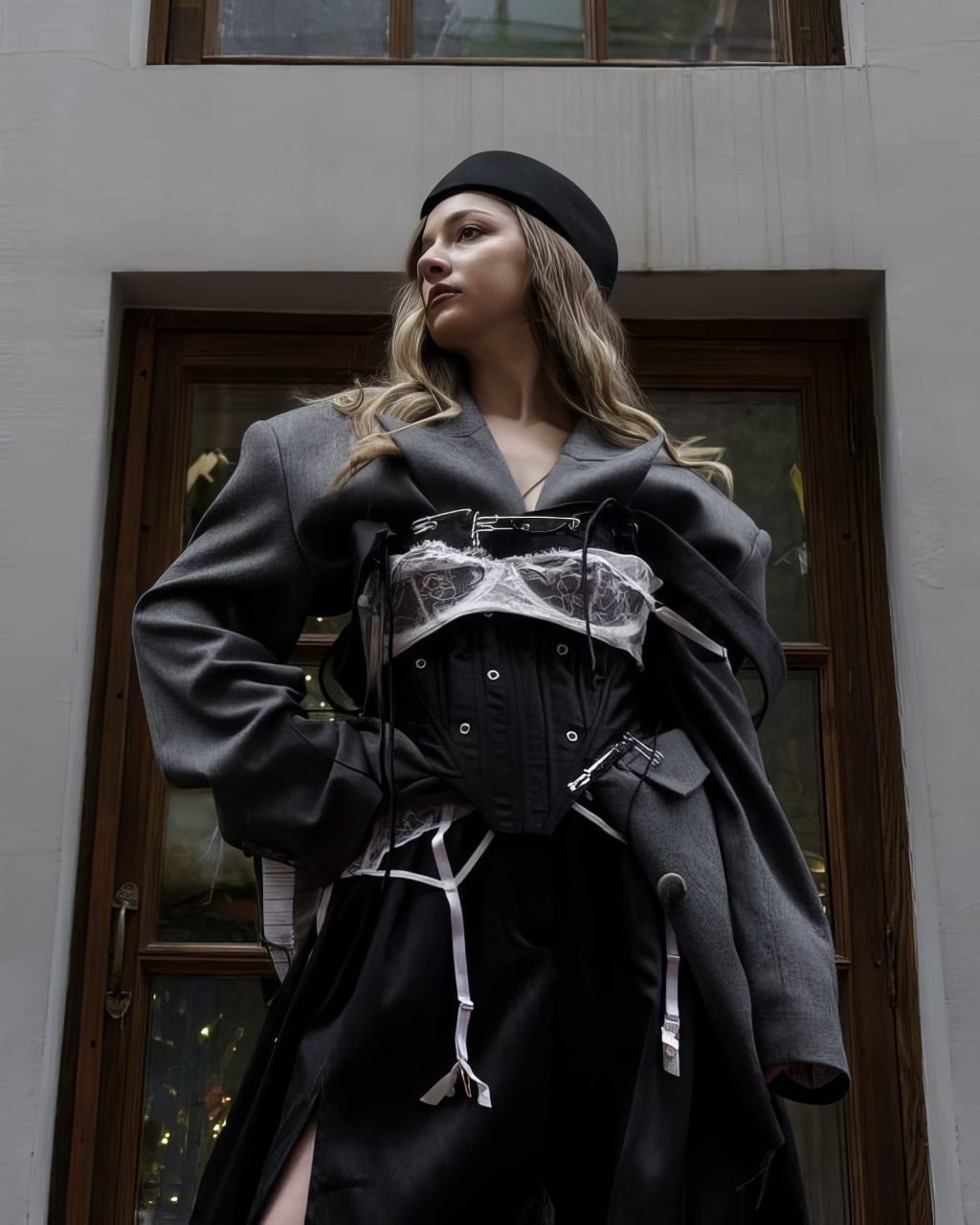 В моей практике бельевые детали становятся манифестом, а не декоративным жестом. Это не просто кружево или бретель — это интимная архитектура образа. Линия корсета, полупрозрачный слой, видимая конструкция бра — все это добавляет глубину и многослойность.
