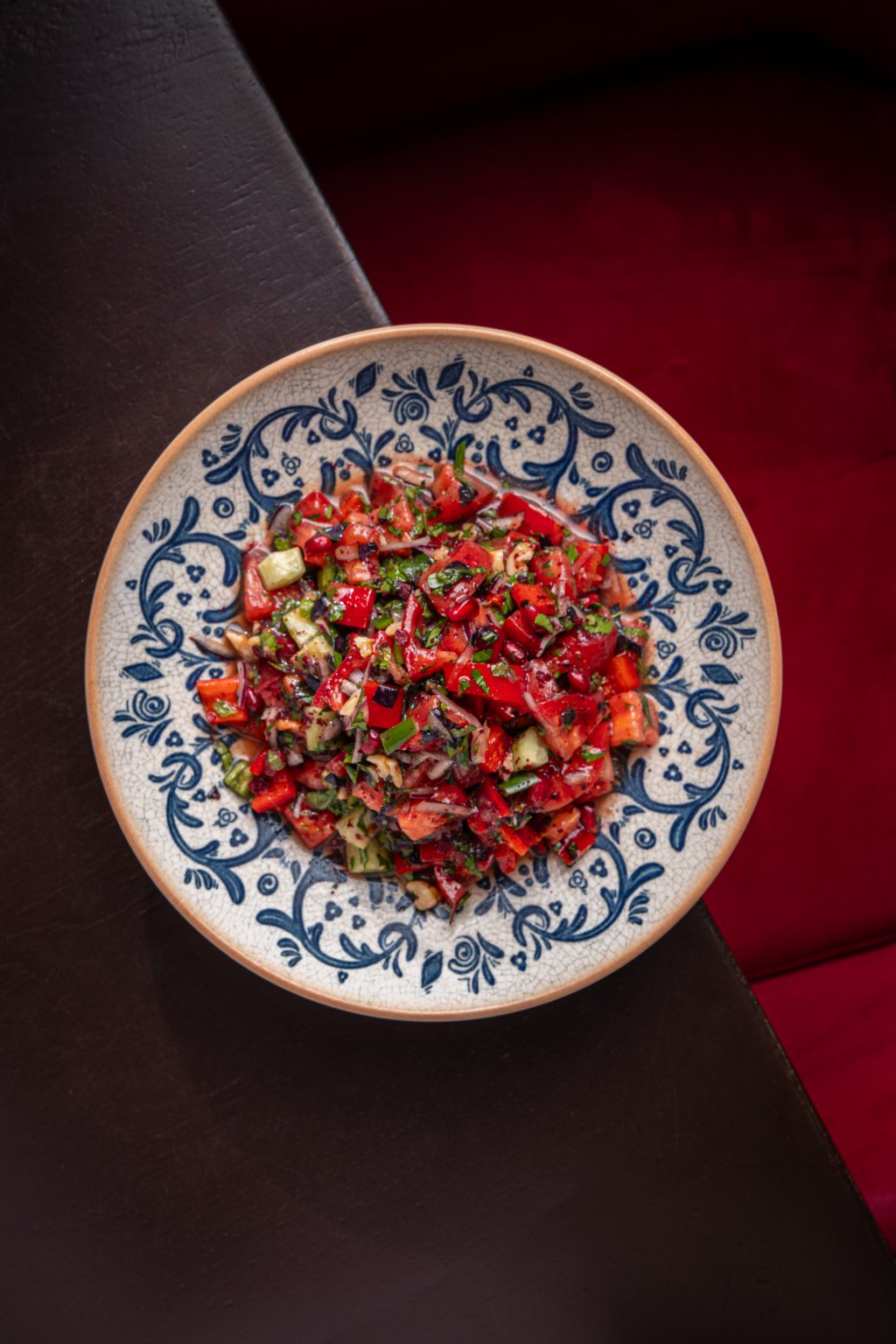 Начать стоит с мезе — эффектной подачи на деревянном подносе с теплыми лепешками и набором насыщенных текстур: мухамара с яркой перечной нотой, нежный хайдари, дымный мутабаль, классический хумус и сочная аджика-эзме. Это не просто закуска, а приглашение к длинному ужину.