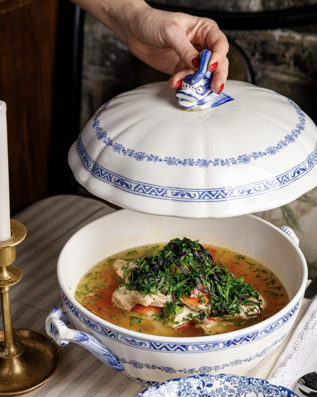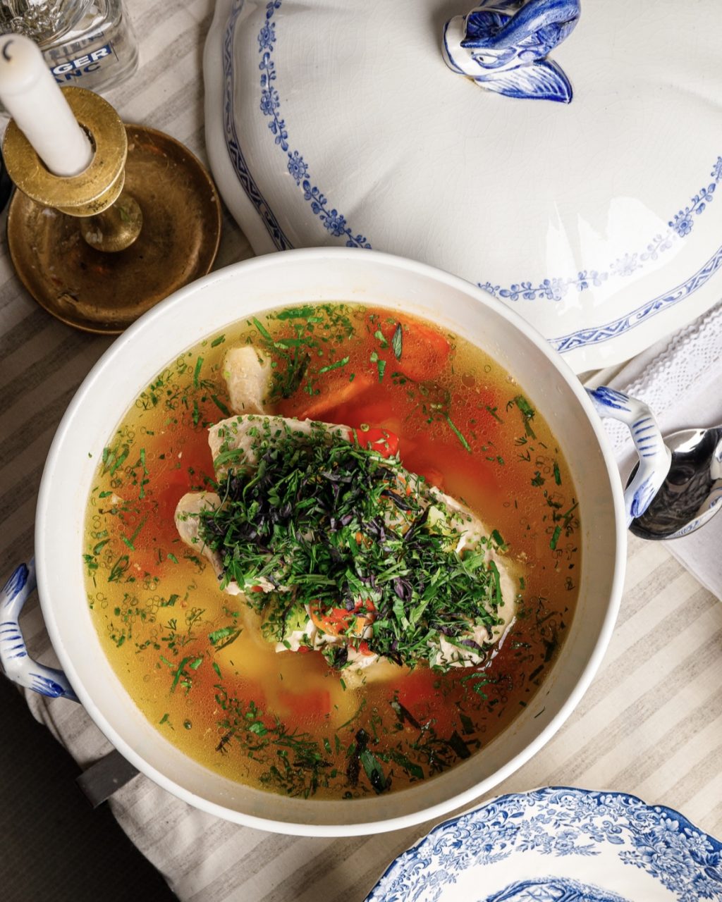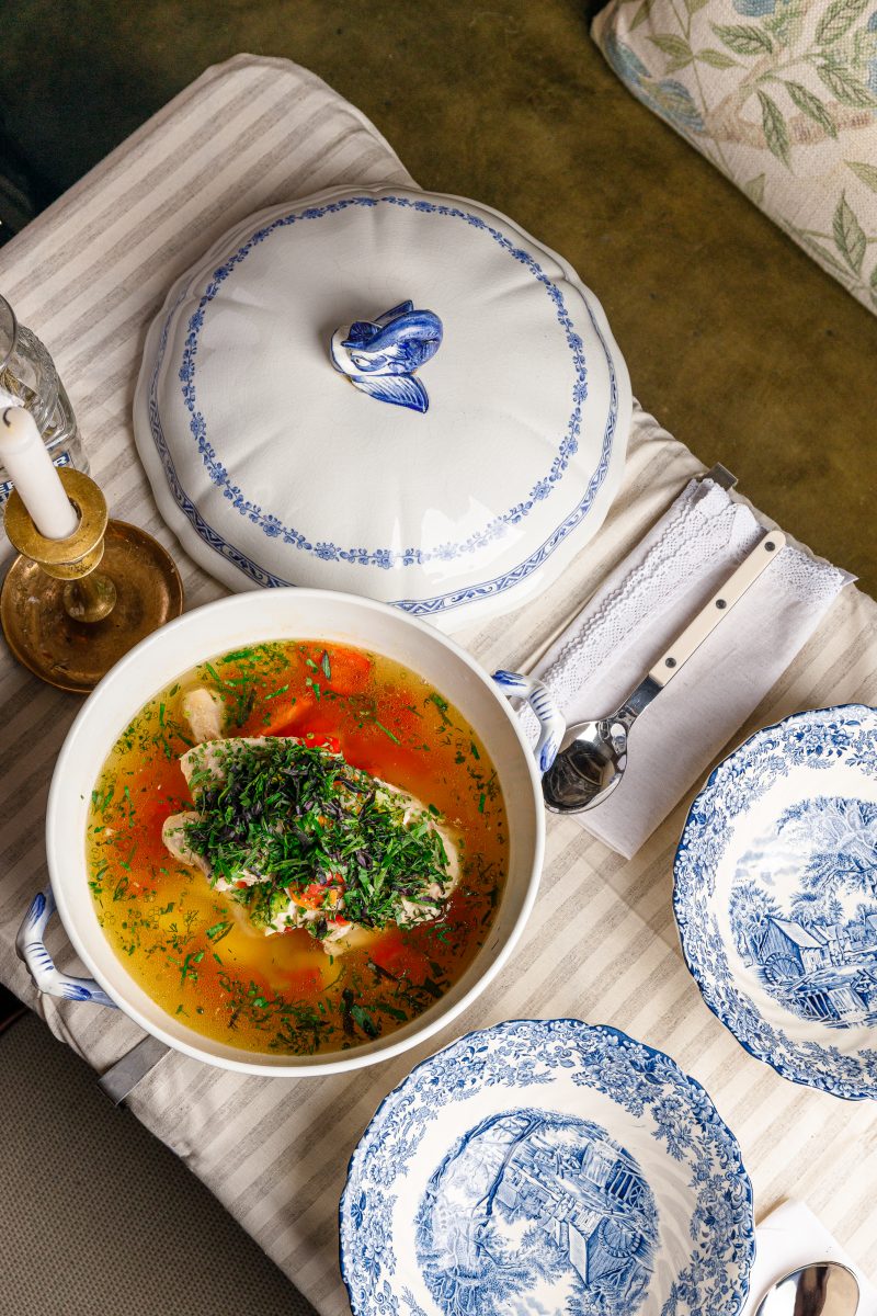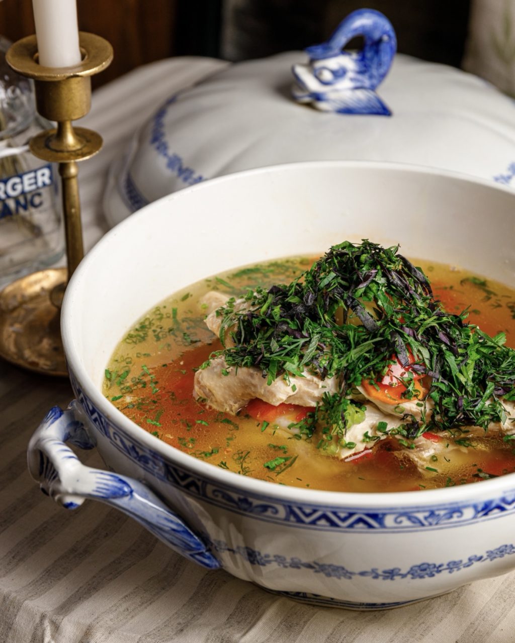 Подача напоминает камерный гастрономический ритуал: аккуратно нарезанное мясо выкладывают в большую винтажную супницу, две половинки петушка без косточек складывают друг на друга, добавляют овощи и щедрую горсть свежей зелени — эстрагон, укроп, петрушку и фиолетовый базилик. Затем всё заливают 400 граммами горячего бульона и подают на двоих, с серебряным половником — как это делали когда-то в старых европейских домах (2 300 рублей на двоих).