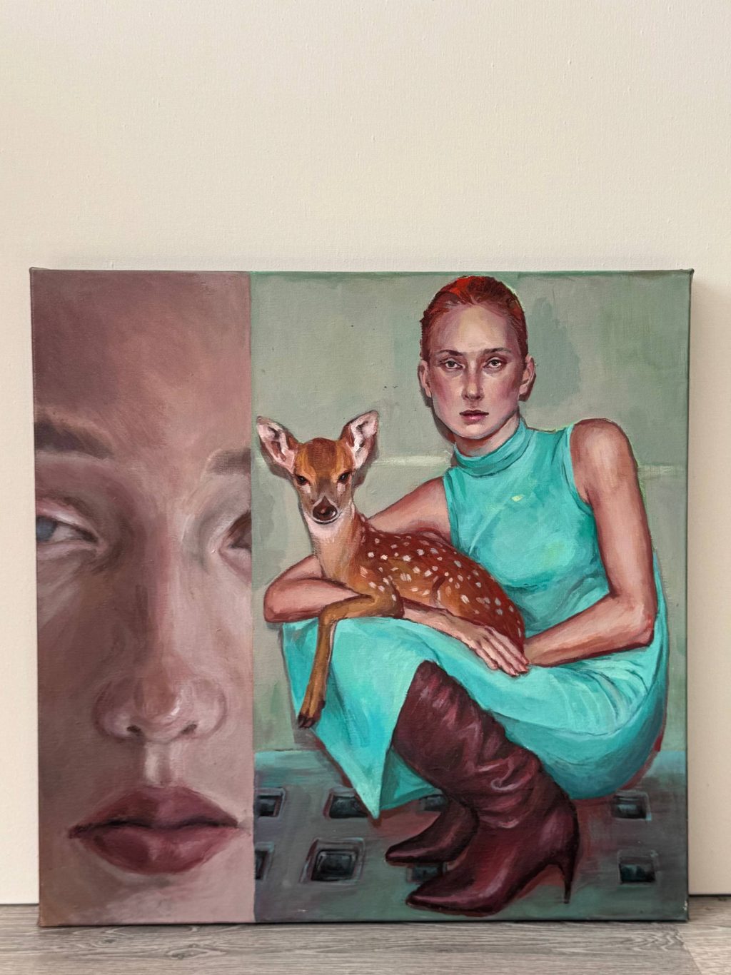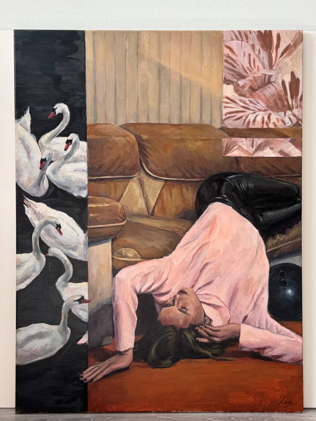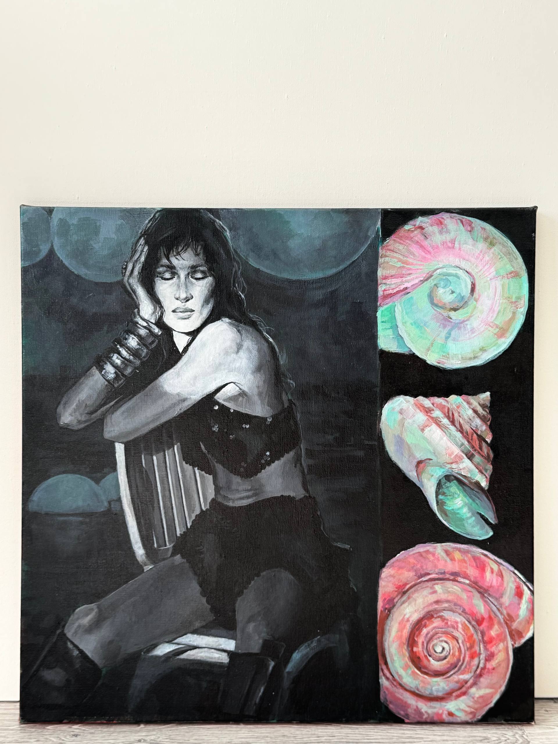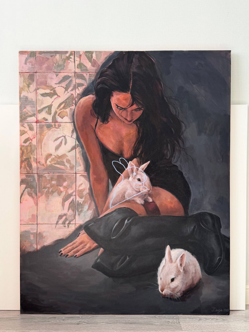 Её работы — это исследование женской энергии, внутреннего состояния и свободы через тонкую визуальную эстетику. Телесные, розовые и тёплые оттенки идеально интегрированы в интерьер бара, усиливая его эмоциональное воздействие.