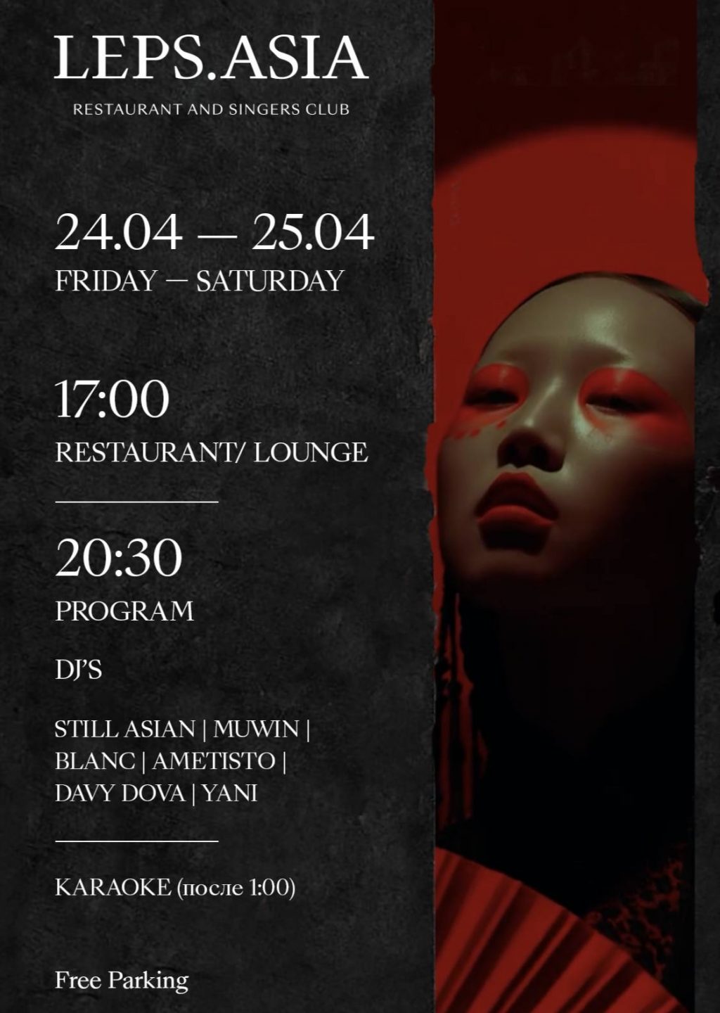 24–25 апреля LEPS.ASIA превращает вечер в многослойное путешествие, где авторская кухня, изысканная подача и ритмы со всего мира формируют единое пространство эмоций.