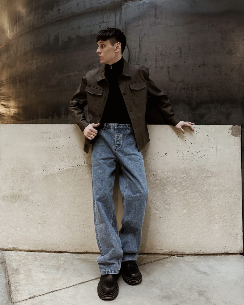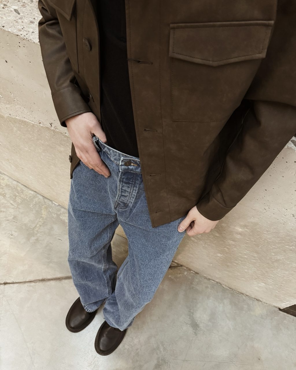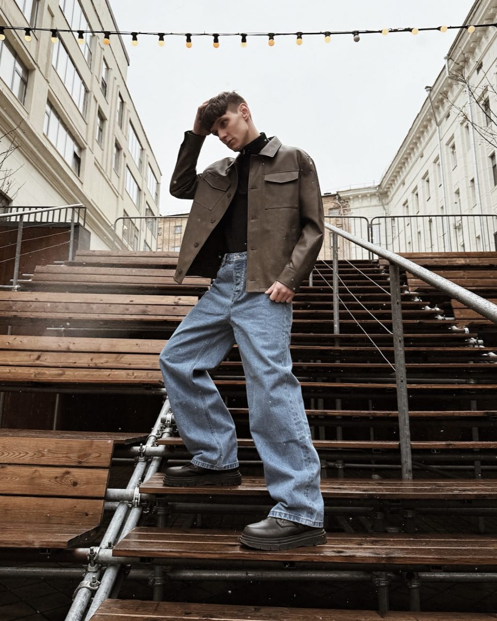 - Вторая — базовый низ с чистой геометрией. Прямые или слегка зауженные брюки, классические джинсы или chinos без лишнего объема снизу создают правильный баланс и позволяют плечам оставаться главным акцентом образа.