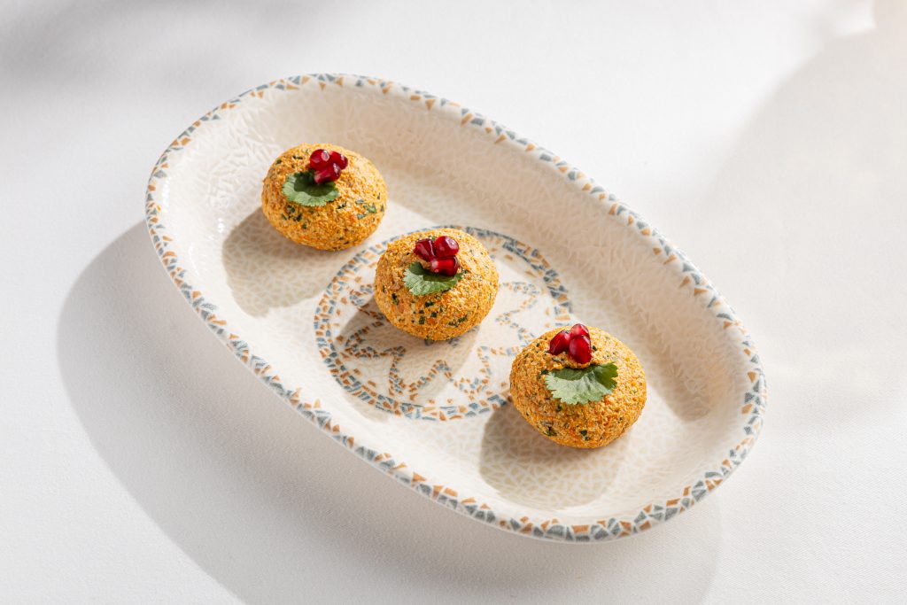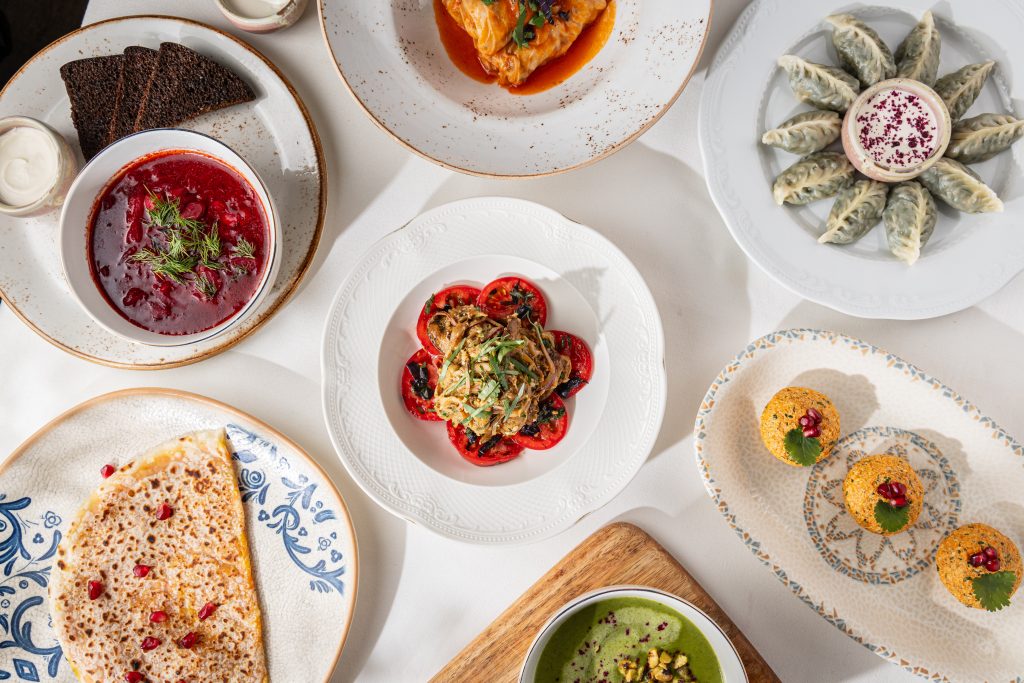 В основе меню — корнеплоды, бобовые, сезонные овощи и зелень. Маринованные опята из домашнего погреба, баклажаны, приготовленные на открытом огне, и насыщенные текстуры овощей создают глубину вкуса, которая не требует мясных акцентов. Это кухня, в которой простота становится достоинством, а знакомые продукты звучат по-новому.