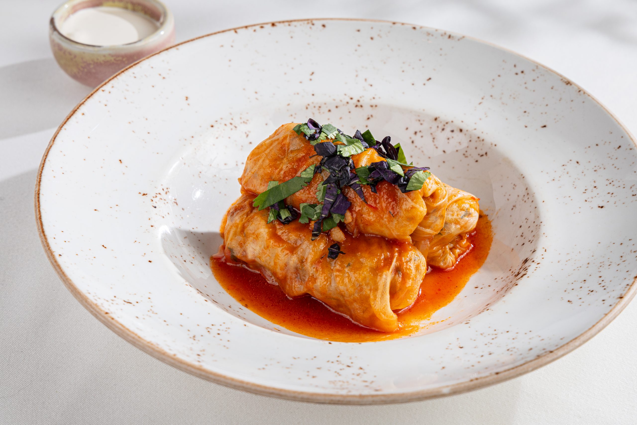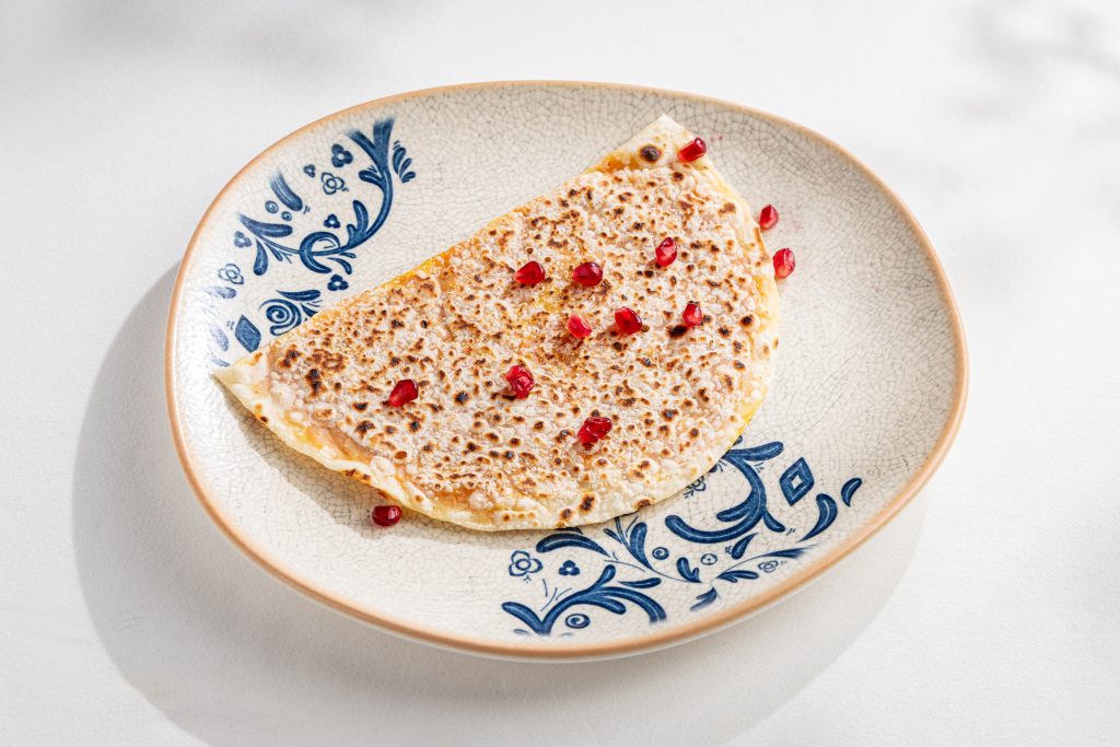 Завершает меню кутаб с вишней — десерт с деликатной кислинкой, который особенно органично сочетается с кофе по-сухумски, приготовленным в джезве на раскалённом песке.