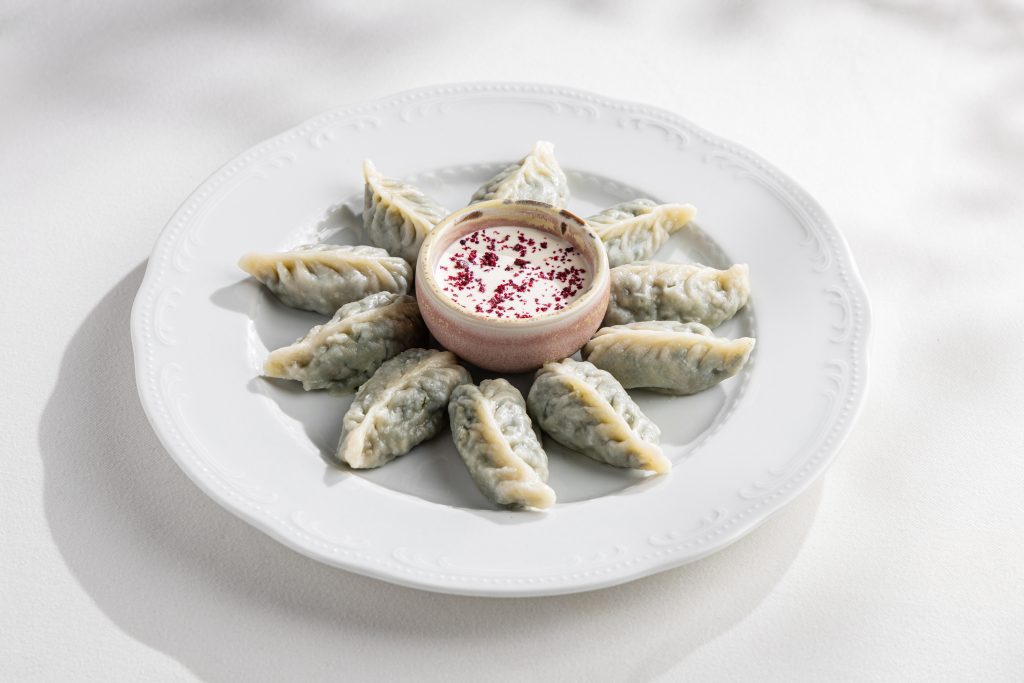 Горячие блюда раскрывают грузинскую кухню в её мягкой, растительной версии: голубцы с булгуром и овощами, хинкали с картофелем и грибами и отварная гюрза со шпинатом — насыщенные, но при этом лёгкие и сбалансированные.