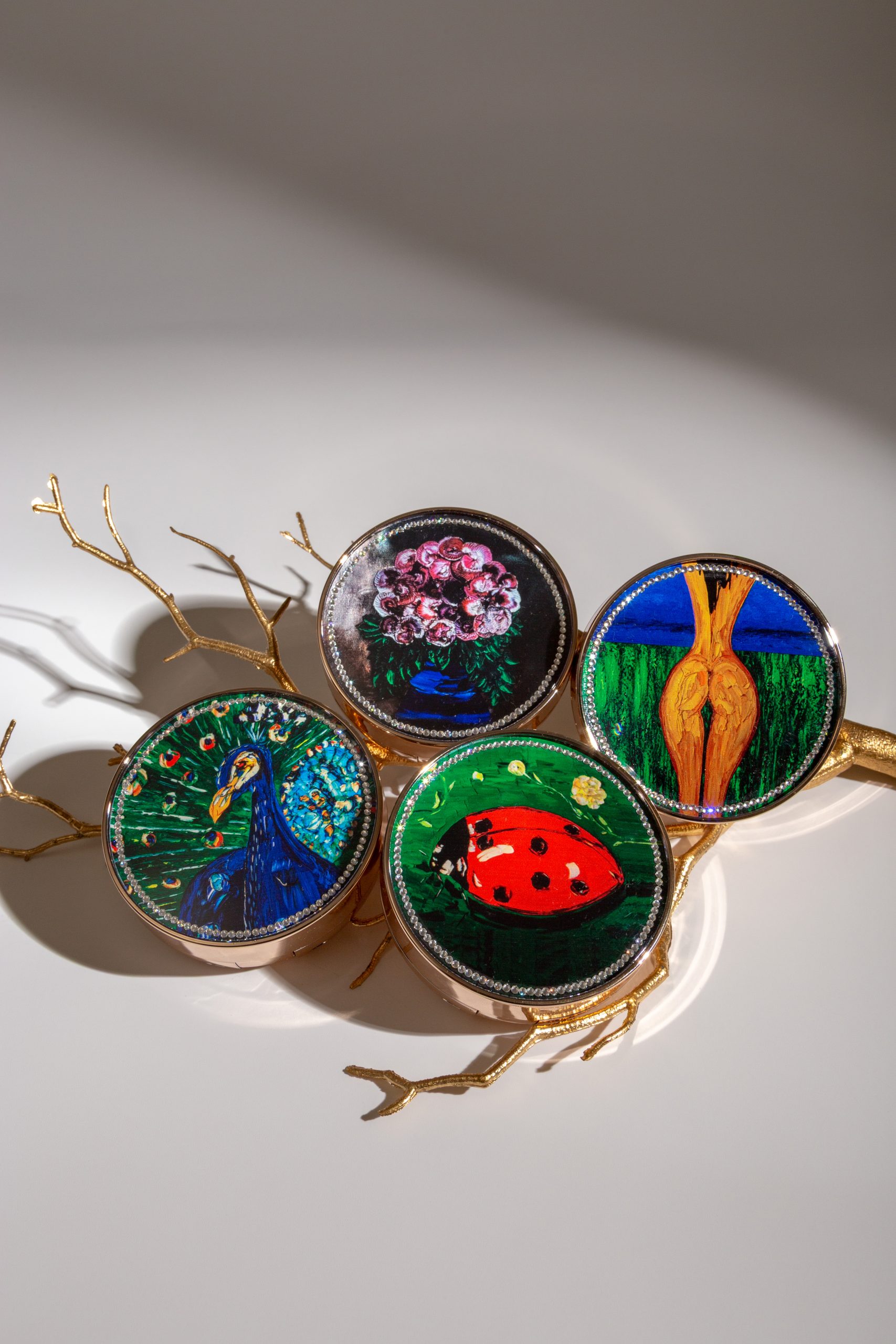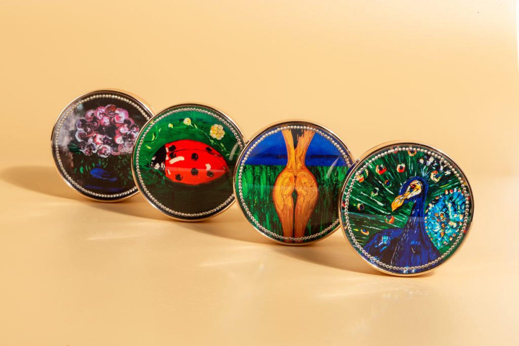 Это настоящее произведение искусства! На крышках, изготовленных из чешского богемского стекла с огранкой Swarovski, изображены фрагменты четырёх его работ: «Бессмертие», «Сосуд жизни», «Изобилие» и «Божья Матерь». Все эти образы, в которые заложен глубокий смысл, пришли свыше через восприятие и руки Алексея. Так, божья коровка считается помощницей Божьей Матери на земле, «Бессмертие» — оберег и вечная молодость, «Павлин» — изобилие и богатство, «Сосуд Жизни» — связь неба и земли, наполненность энергией и ресурсность. В комплекте с кушоном идёт открытка с номерной картой для возможности выиграть жикле этого полотна с добавлением мазков самого художника и оригинальной подписью автора.