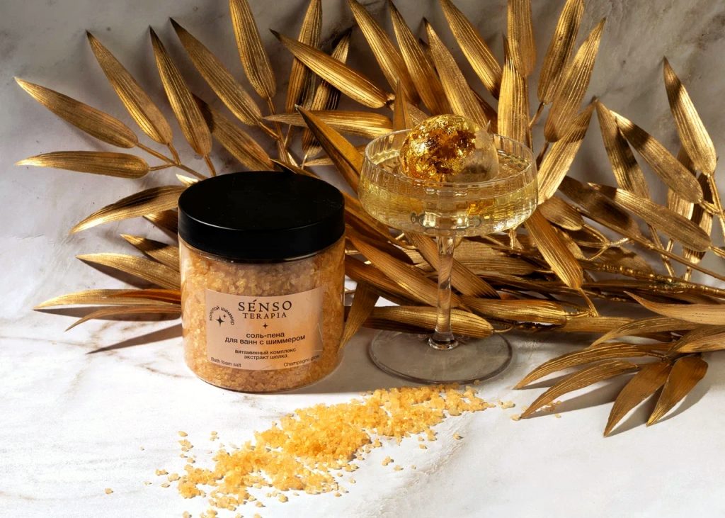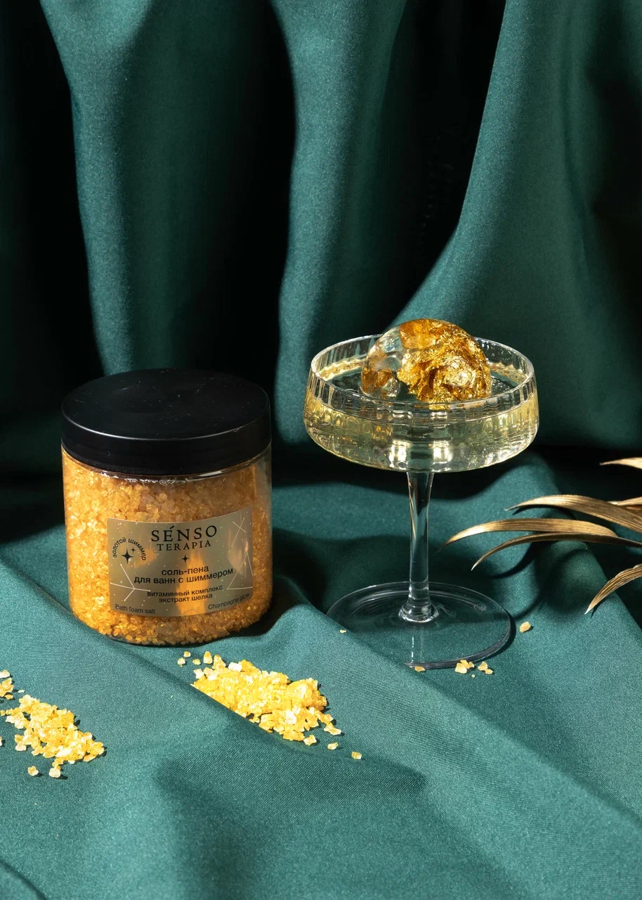 Senso Terapia — бренд ухода для тела и чувств, вдохновлённый эстетикой замедления и тактильного удовольствия. Соль для ванн Champagne Glow — это россыпь сияющих кристаллов, которые, растворяясь в воде, напоминают пузырьки просекко: мерцающие, живые, создающие ощущение праздника и глубокой релаксации.