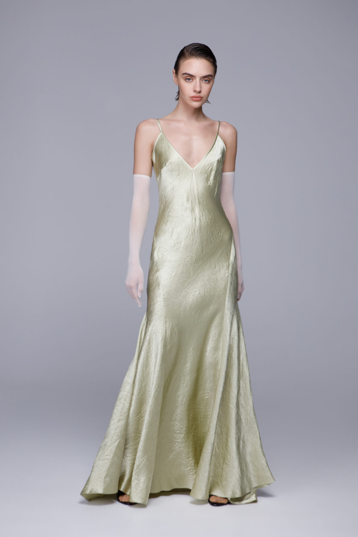 Комбинация Ева — скроенная по косой комбинация с фигурными рельефами на бедрах и деликатным клешением по низу, плавно переходящим в шлейф. Тонкие бретели, глубокое декольте спереди и еще более глубокий вырез, открывающий спину. Это платье создано для тех, кто желает оставить о себе неизгладимое впечатление.