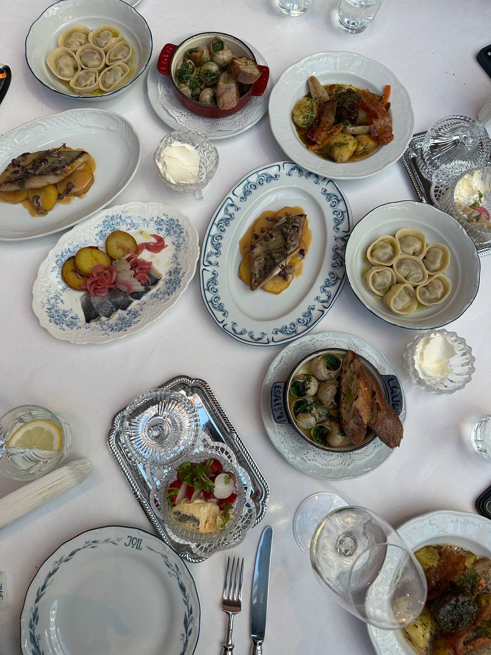Кухню возглавил Евгений Энгельке — шеф с более чем 25-летним опытом. Меню строится вокруг петербургской праздничной кухни с французскими акцентами: сморреброды на закваске, грузди со сметаной, винегрет с килькой, домашние пельмени и расстегай с форелью.