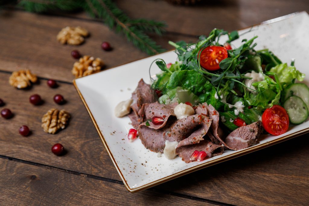 - Ростбиф с миксом зелени, киноа и имбирно-кунжутным соусом — 279 р / 100 г