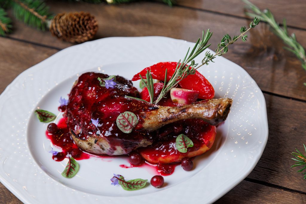 - Запечённая утиная ножка с айвой и клюквой в ягодном соусе — 199 р / 100 г