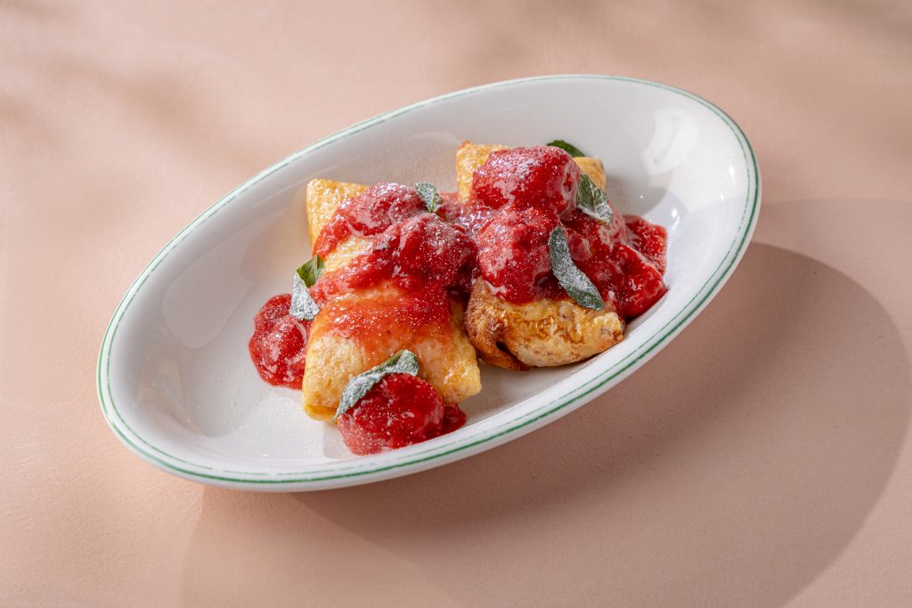 В десертной части меню — блины с творогом и клубничным компоте. Лёгкая кислинка ягод оттеняет нежность творожной начинки, а тёплая текстура блина делает вкус объёмным и по-домашнему уютным. Это тот случай, когда простота становится главным достоинством.