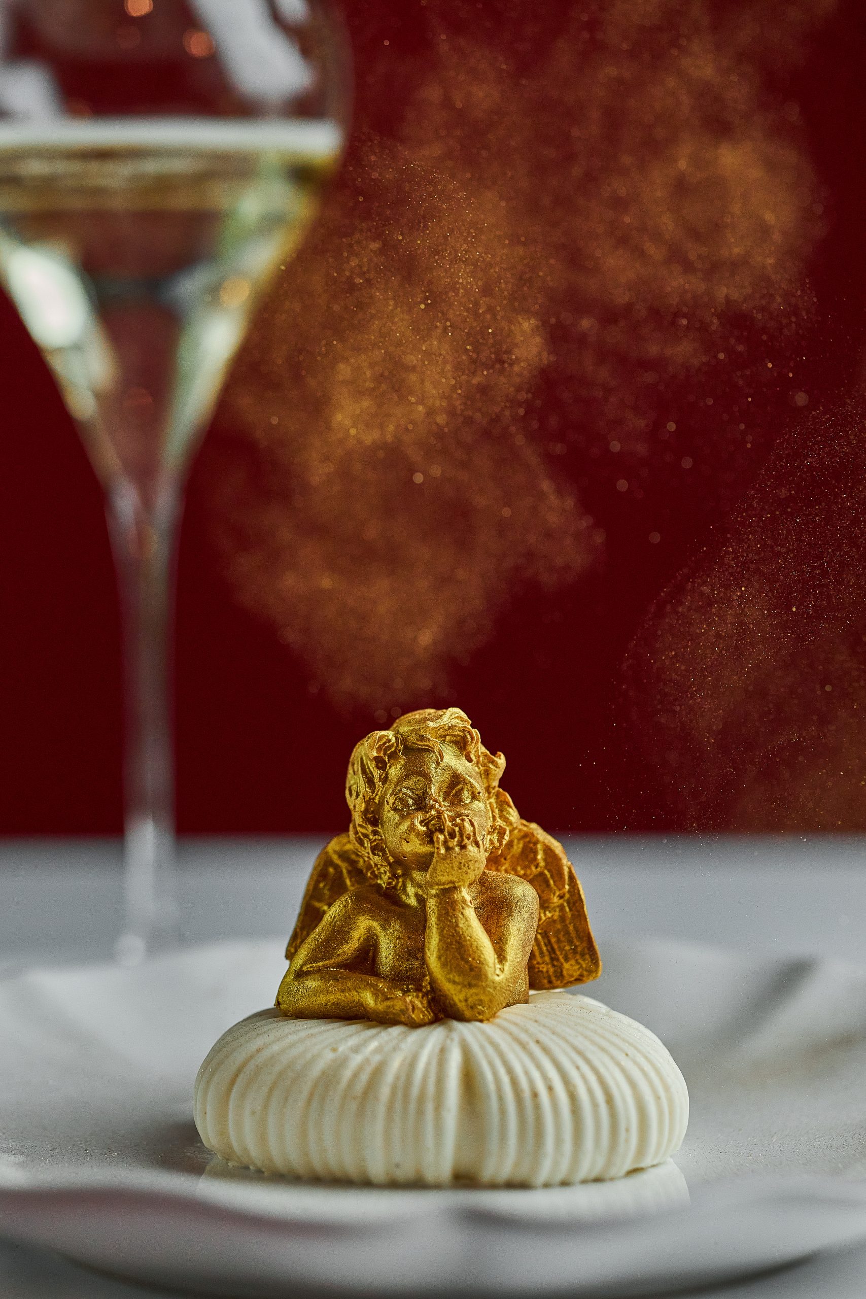 В сет (1 900 руб.) входит творожно-сливочный десерт в виде вязаного сердца с купидоном из молочного шоколада, покрытого сусальным золотом, а также напиток на выбор — клюквенно-имбирный чай или бокал игристого.