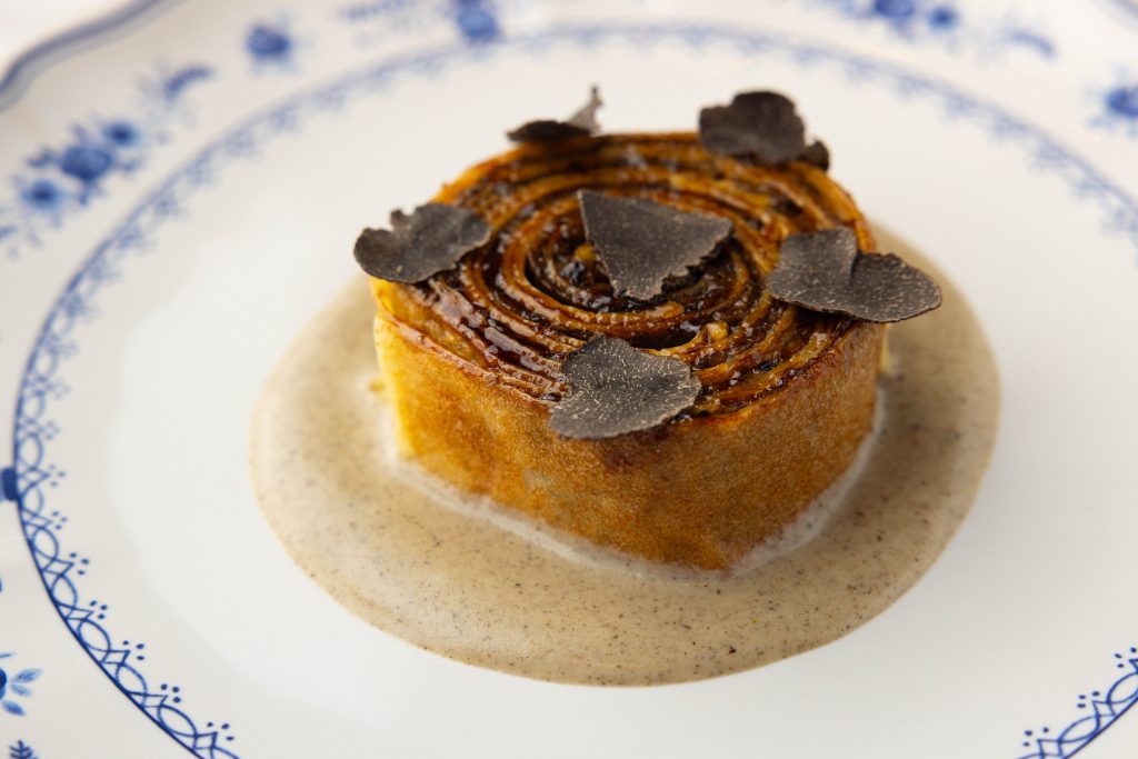 Блинный рулет с грибами (650 руб.) — ароматный гимн итальянским лесам. Обжаренные лесные грибы, тончайшие блины по фирменному рецепту и щедрый штрих трюфеля. Легкая сметанная кислинка работает как балансир, подчеркивая землистые ноты и делая вкус объемным. Блюдо звучит насыщенно, но изящно.