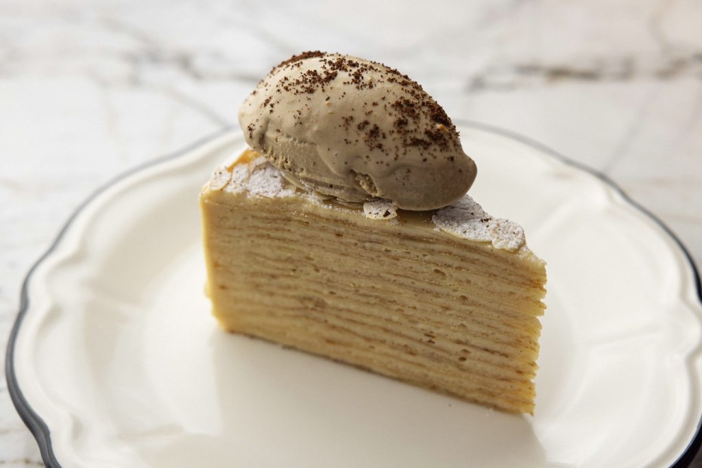 Финальный аккорд — работа шеф-кондитера Фатима Салех: блинный торт, вдохновленный миндальным круассаном (850 руб.). Между тонкими блинами — крем на основе ванильного ганаша с миндальной пастой и дробленым миндалем. Сверху — обжаренные миндальные лепестки с сахарной пудрой, шарик кофейного мороженого с апельсиновой цедрой и легкая пыль молотого кофе. Десерт, который просит в пару эспрессо или крепкий черный чай.