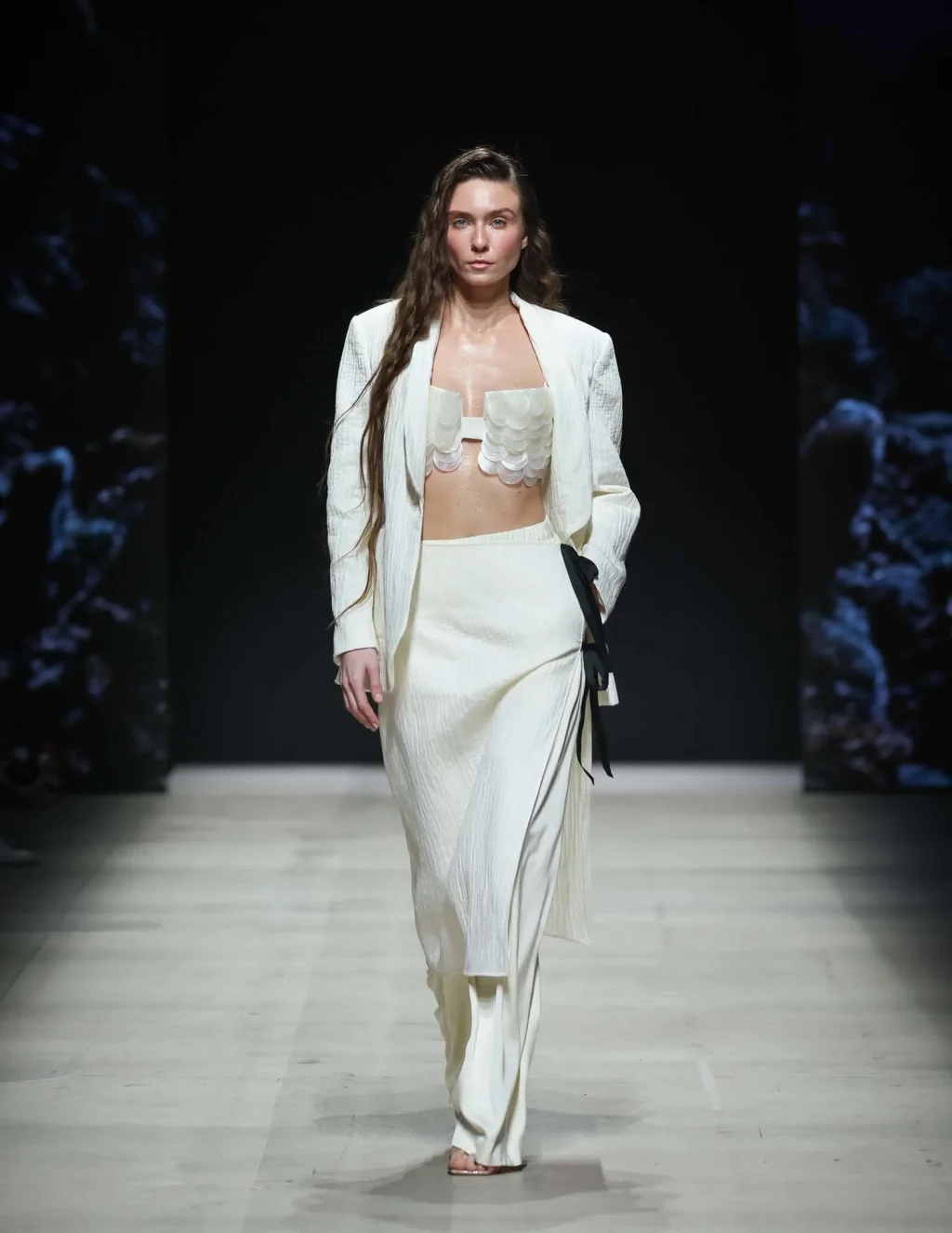 Эффект мокрой ткани, авторская работа с поверхностями и специально созданное звуковое сопровождение формируют полное погружение. Показ становится не просто демонстрацией одежды, а опытом — почти физическим ощущением пространства и среды.