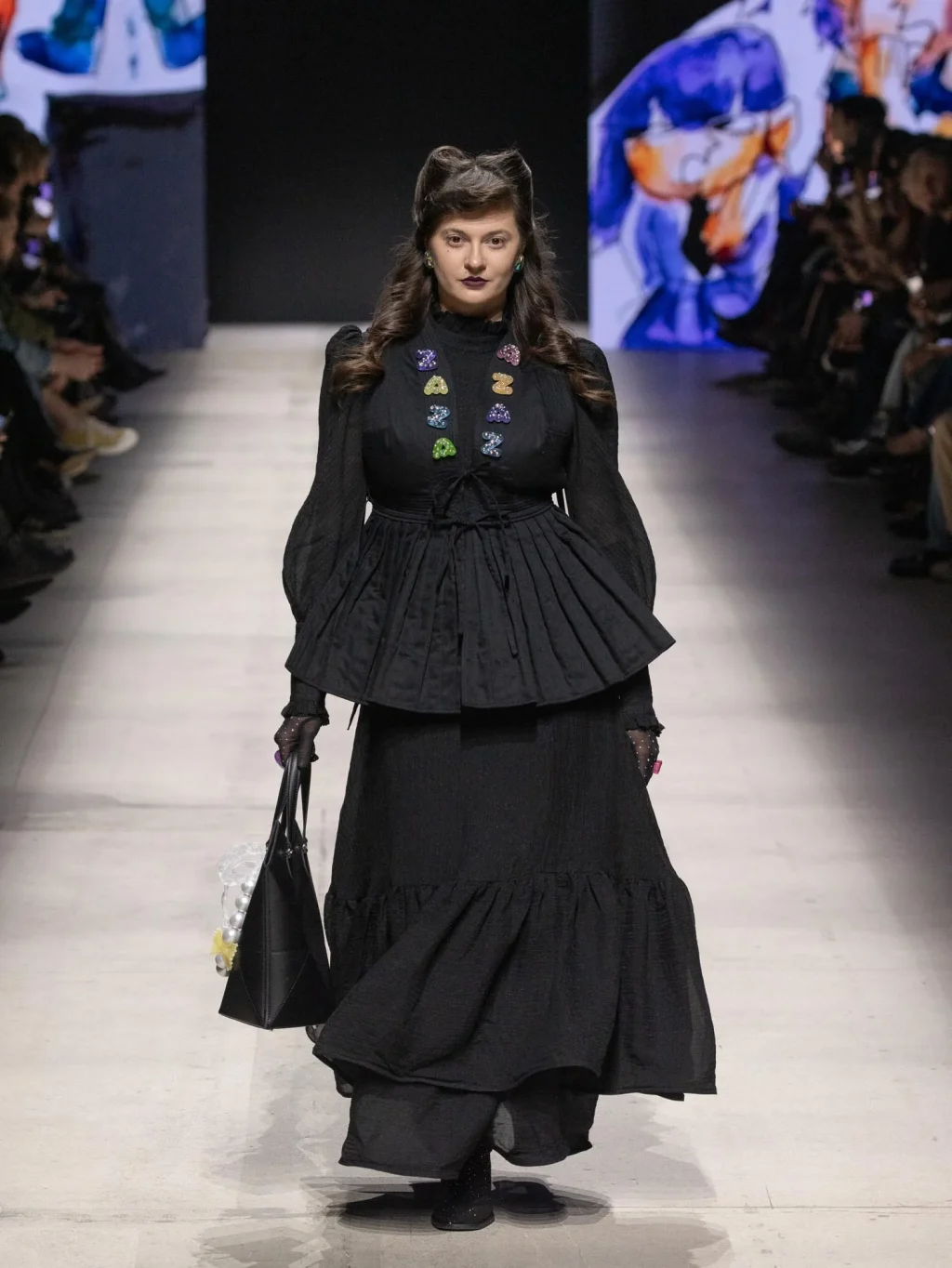 Цветовая палитра — от нежных рассветных оттенков до глубокого чёрного — усиливает драматургию образов. Финальный акцент — обувь от O’SHADE, органично завершающая стилистическую композицию показа.