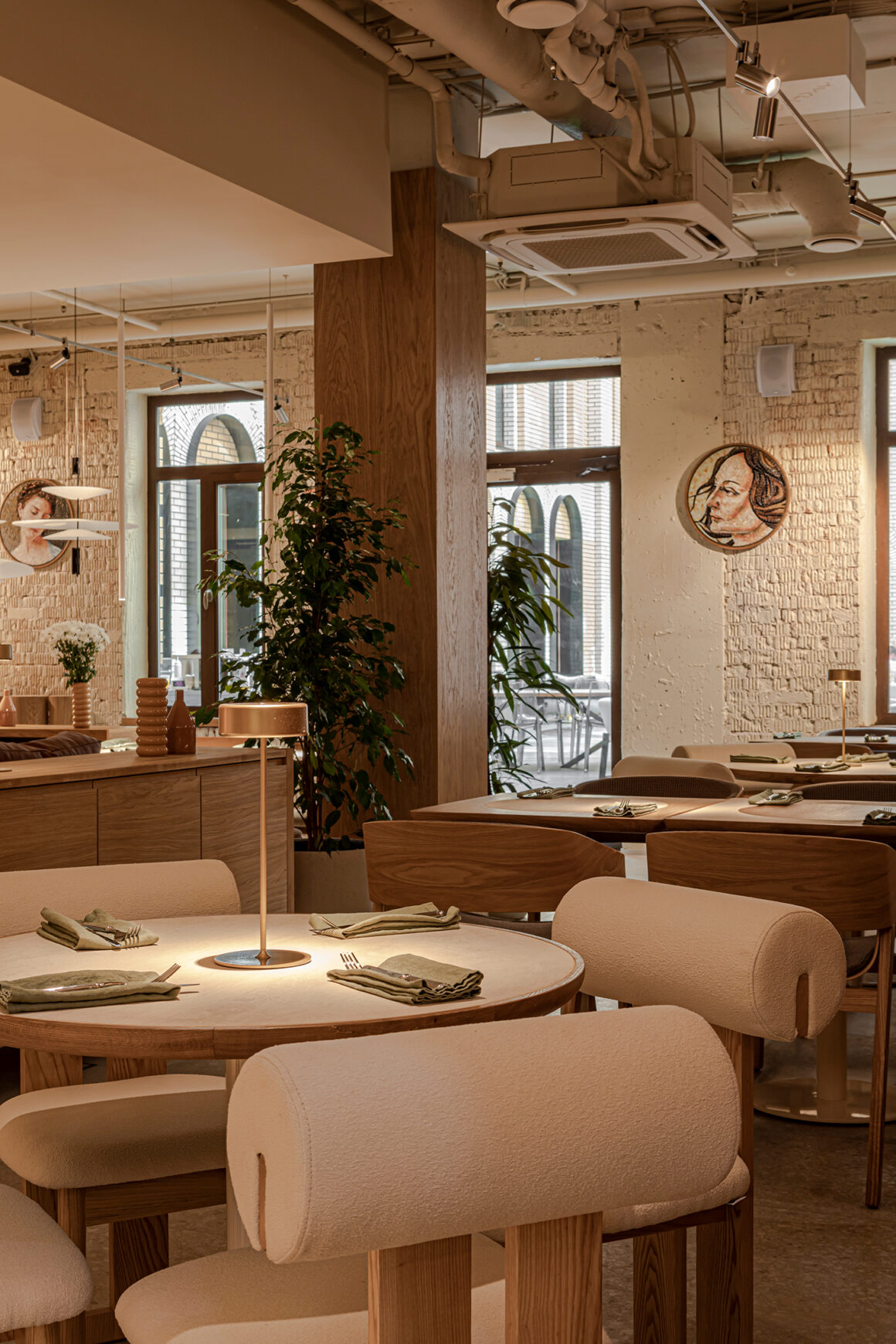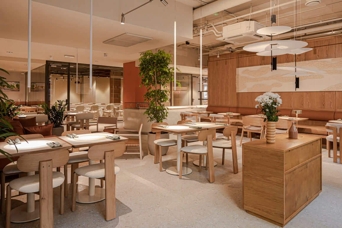 Дизайн интерьера разработан внутренней командой при содействии Pergaev Bureau. В основе — натуральные оттенки, дерево, травертин, бетон, классические принты и мотивирующие цитаты из любимых книг Амины. В интерьере сочетаются уникальные детали: колонна в шашечку, открытые коммуникации и большой стол с разными вариантами посадки. Тёплое освещение создаёт атмосферу заката. Пространство организовано удобно: LOOK UP — бар, кафе и магазин; UPSKILL — университет с 16 аудиториями, оснащёнными маркерно-магнитными стенами и проекторами