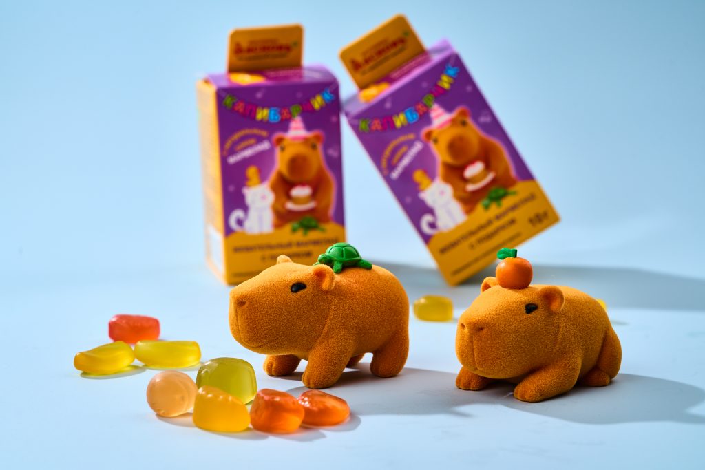 Для детей также появится мармелад с натуральными фруктовыми и ягодными соками (235 р.), который станет не только вкусным угощением, но и интересным подарком, ведь в каждой упаковке будет фигурка-капибара. Коллекция включает шесть разных персонажей.