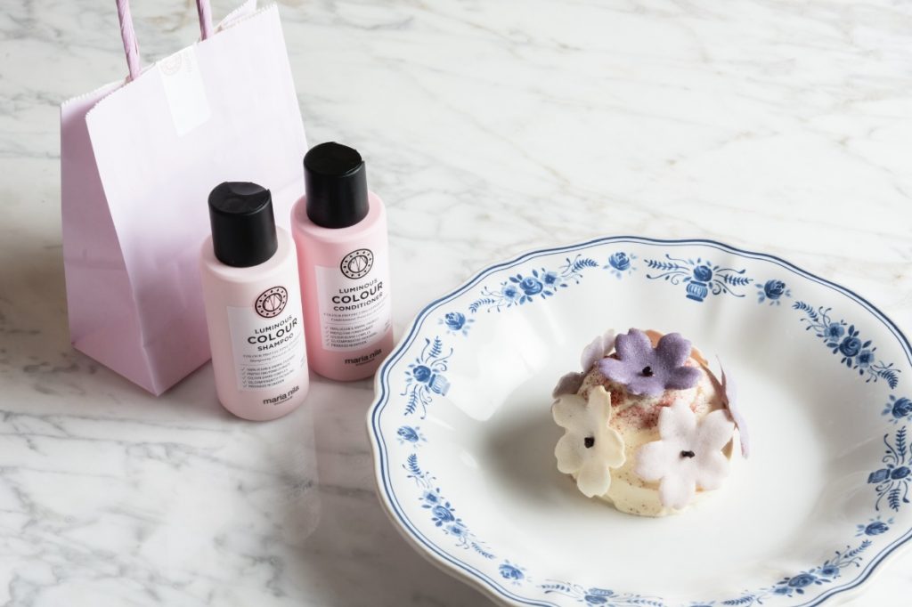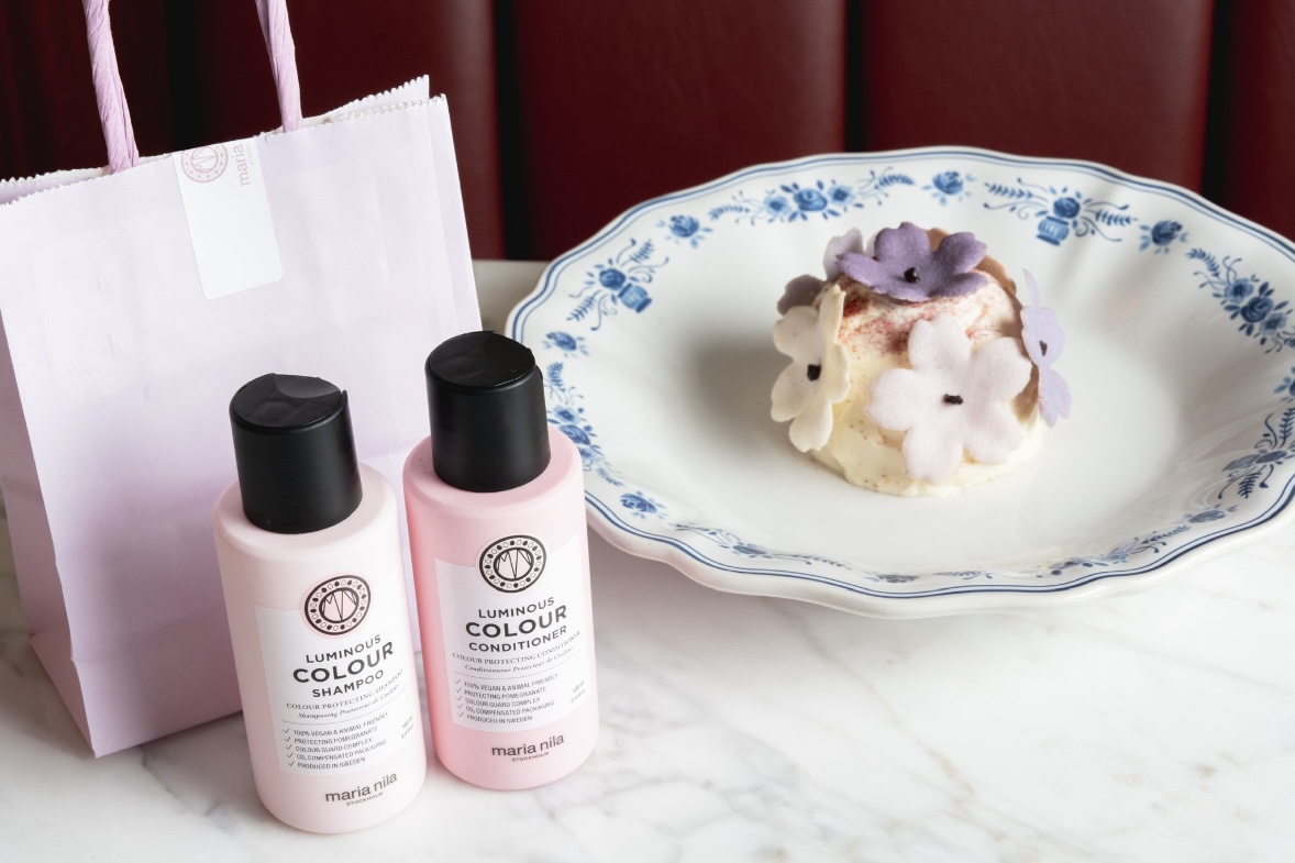 Но главное — десерт сопровождается подарком. К нему гости получают набор средств «Сияние цвета» от бренда Maria Nila: шампунь и кондиционер, которые восстанавливают структуру волос, защищают их от воздействия солнечных лучей и помогают сохранить насыщенность оттенка и естественный блеск.