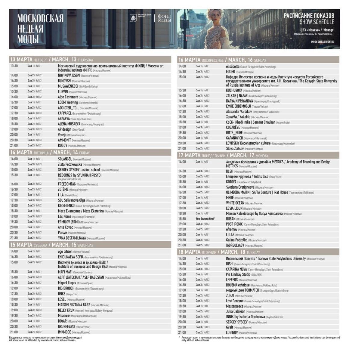 Опубликовано расписание показов четвертой Московской недели моды, которая пройдет с 13 по 18 марта в Центральном выставочном зале «Манеж»
