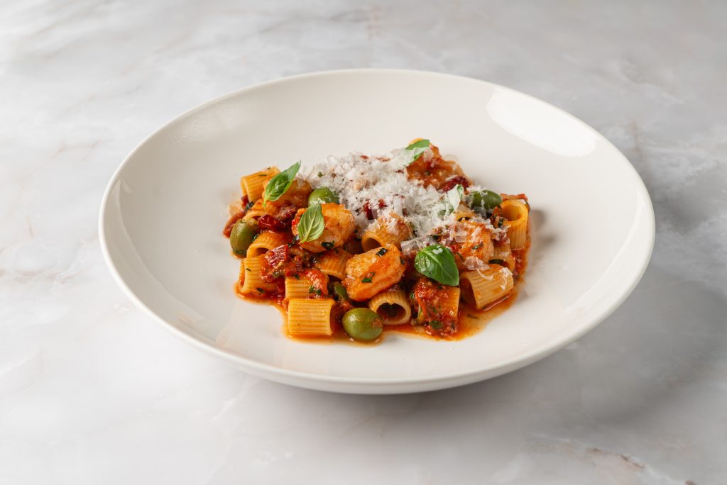 Не менее эффектна паста с креветками в томатном соусе с базиликом (1390 руб.) — гармония морских нот и пряной южной атмосферы. В основе — паста мадземанике с тигровыми креветками в насыщенном соусе из трёх видов томатов, белого вина и рыбного бульона. Акценты — вяленые томаты, оливки, базилик и пармезан — создают вкус, в котором чувствуется тепло итальянской кухни.