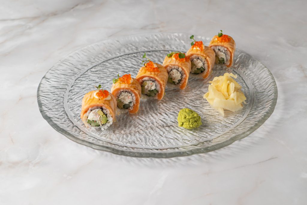 Ещё одна новинка — ролл с опалённым лососем, крабом и красной икрой (1490 руб.) — пример того, как традиционная японская техника становится частью современного фьюжна. Классическая начинка из краба, сливочного сыра, авокадо и огурца сочетается с деликатной текстурой свежего лосося, который опаливают перед подачей, раскрывая глубину вкуса.