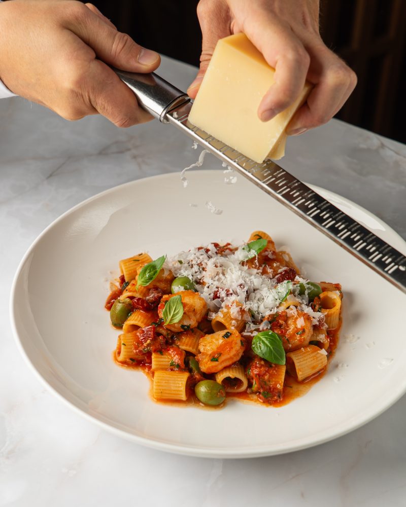 Не менее эффектна паста с креветками в томатном соусе с базиликом (1390 руб.) — гармония морских нот и пряной южной атмосферы. В основе — паста мадземанике с тигровыми креветками в насыщенном соусе из трёх видов томатов, белого вина и рыбного бульона. Акценты — вяленые томаты, оливки, базилик и пармезан — создают вкус, в котором чувствуется тепло итальянской кухни.