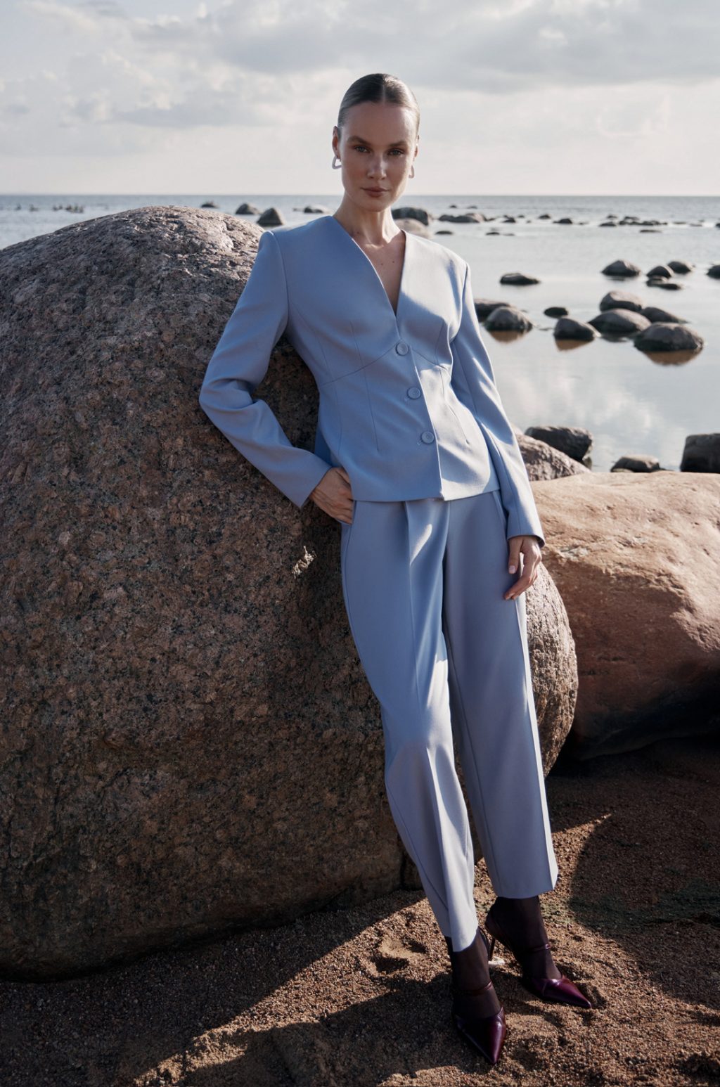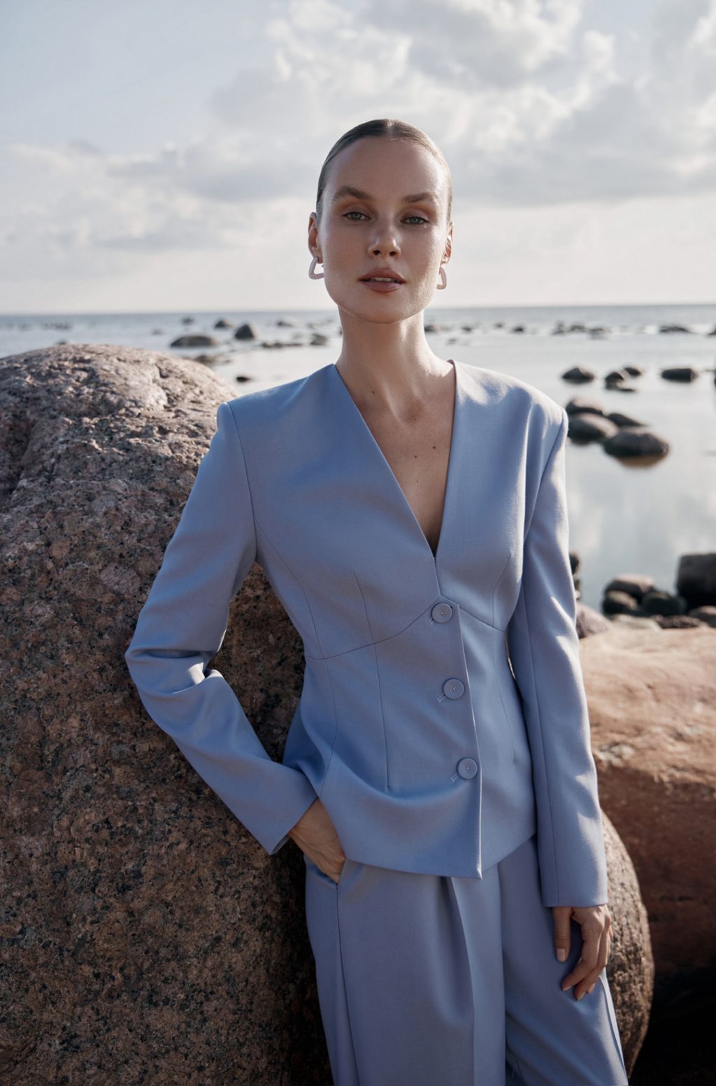 Цвет безоблачного неба задает дуэту жакета DAPHNE и брюк HEDY мягкое осеннее звучание и при этом легко сочетается с множеством тонов, от светлых молочных до более насыщенных — графитового, шоколадного, хаки, бордо.
