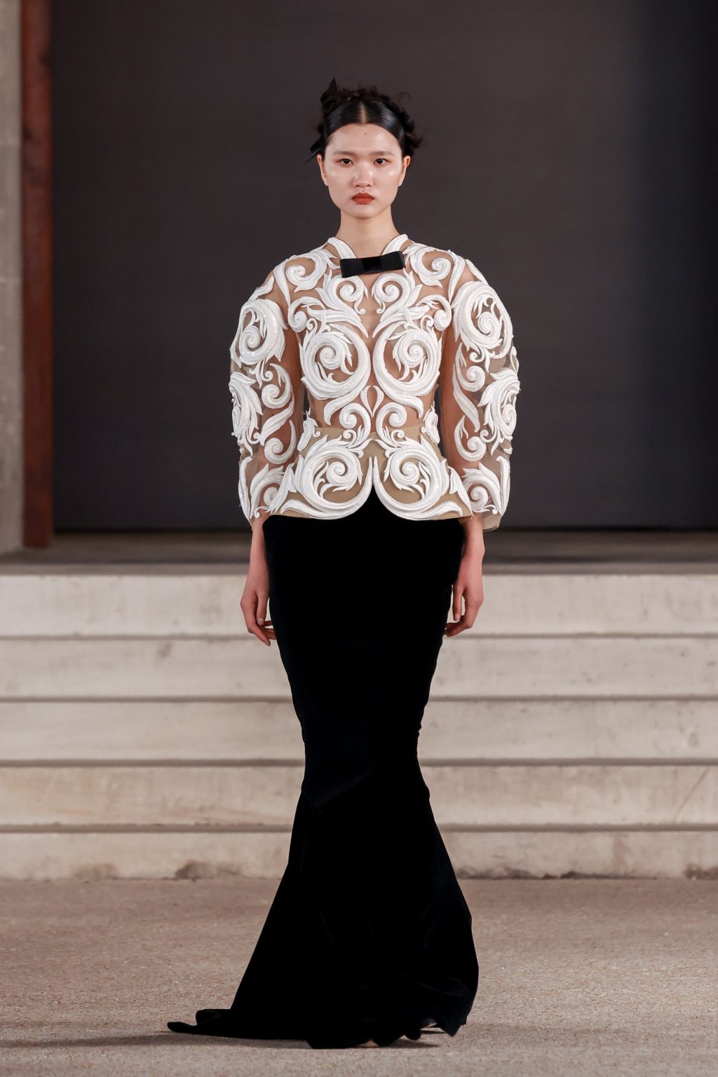 Коллекция «Архитектурная» FW’2025/26 раскрылась в строгой чёрно-белой гамме, где конструктивность форм доведена до предела точности: барельефная вышивка, аппликативные орнаменты и филигранная гладь превращают ткань в скульптуру.