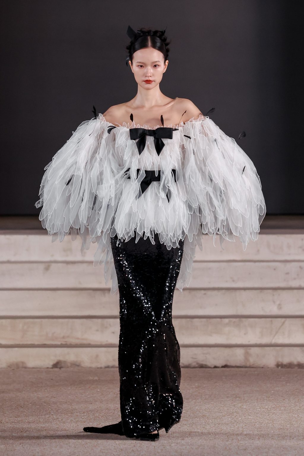 В центре показа — селекция из 30 iconic-образов из архивов YANINA Couture и новая кутюрная серия. Ключевым акцентом стала коллекция «Габриэль» SS’26, впервые представленная в Париже на Неделе Высокой моды: утончённые силуэты, контрастные белые воротнички и вышивка с колосьями из рафии — как символ внутренней силы, роста и новых возможностей.