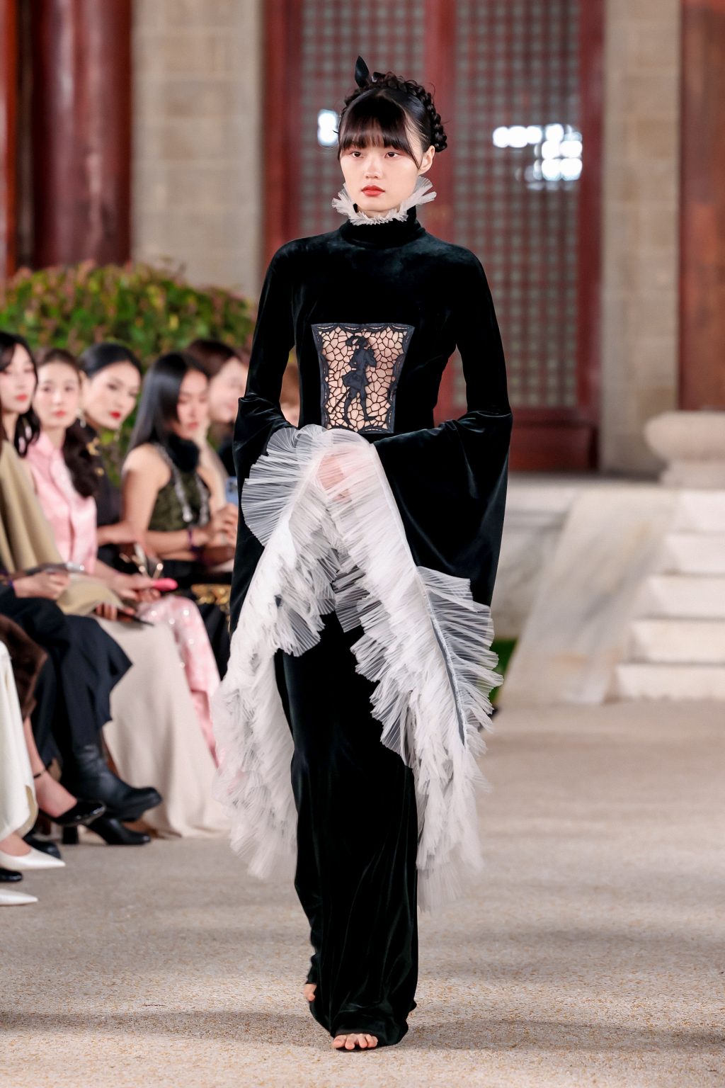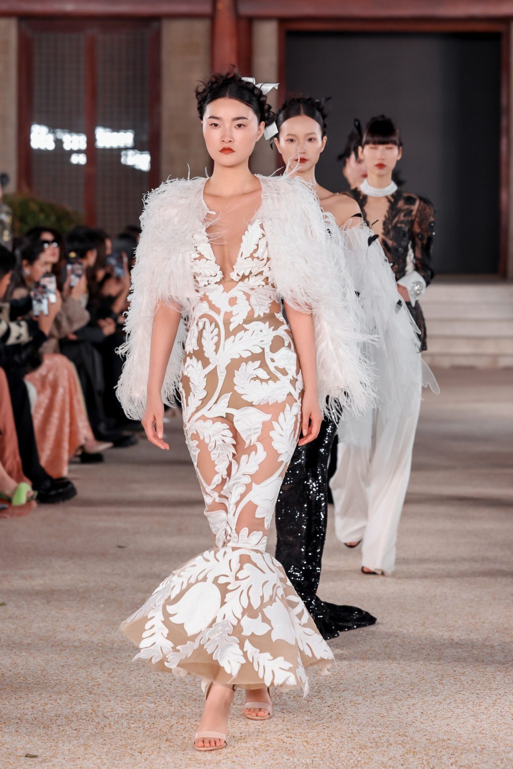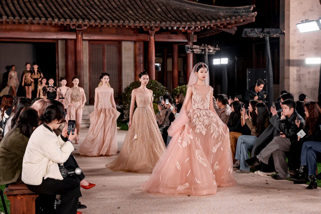 Сценография, созданная самим пространством Цзяннаня, задала особую оптику восприятия: подиум словно растворялся в воде, отражая силуэты, превращая каждый выход в почти кинематографический кадр.