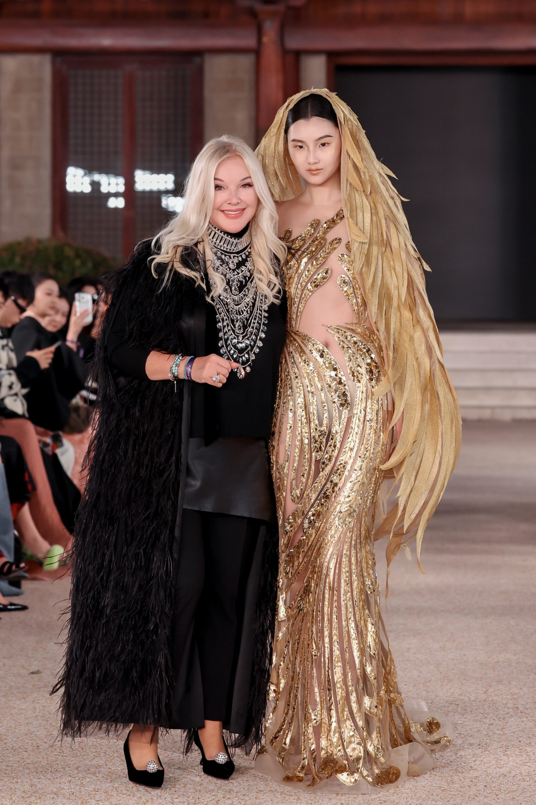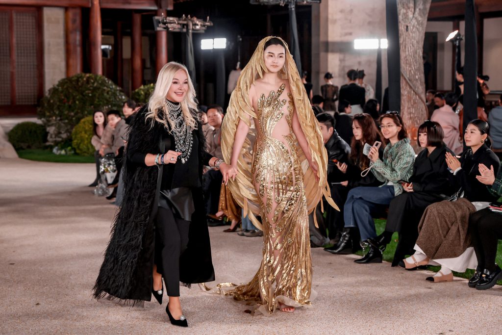 Кульминацией вечера стал легендарный золотой образ с накидкой-крыльями из коллекции «Феникс» SS’24 — визуальный символ триумфа, завершённый выходом основателя и креативного директора Модного Дома Юлии Яниной.