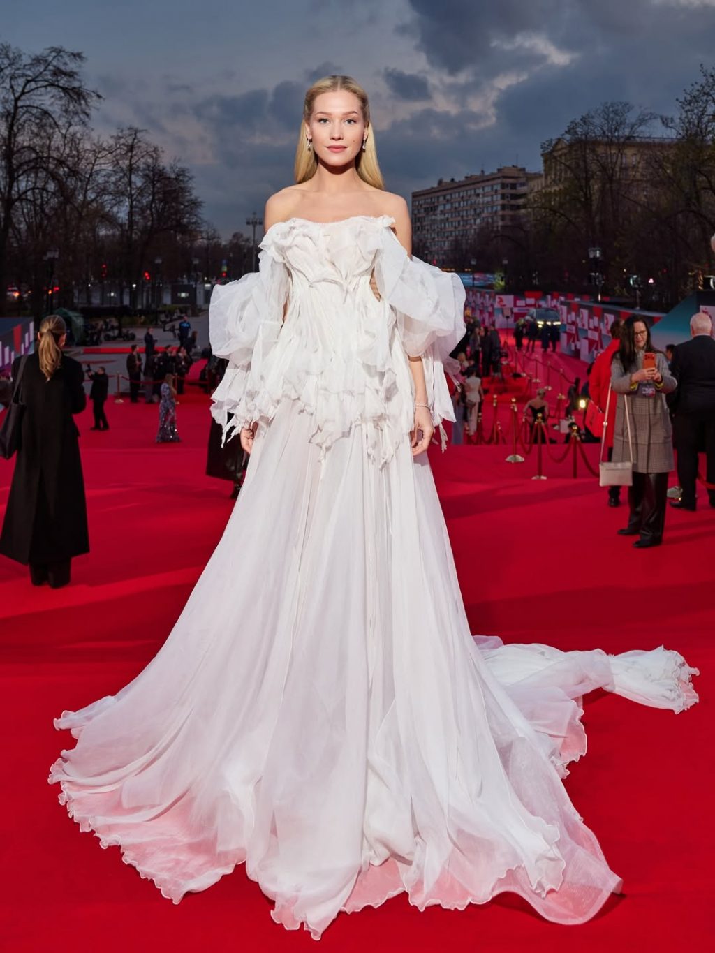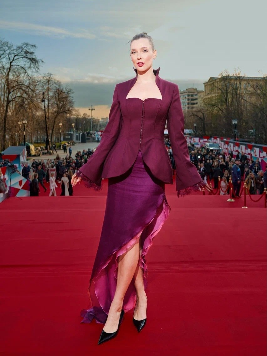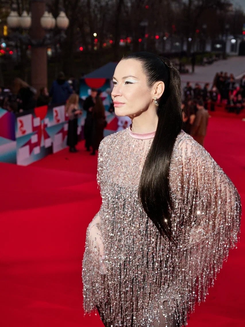 - Александра Киселёва продемонстрировала кутюрный подход в образе от Smirnova Couture — платье-колонна, расшитое стразами, в сочетании с перчатками и вуалью выглядело почти кинематографично.