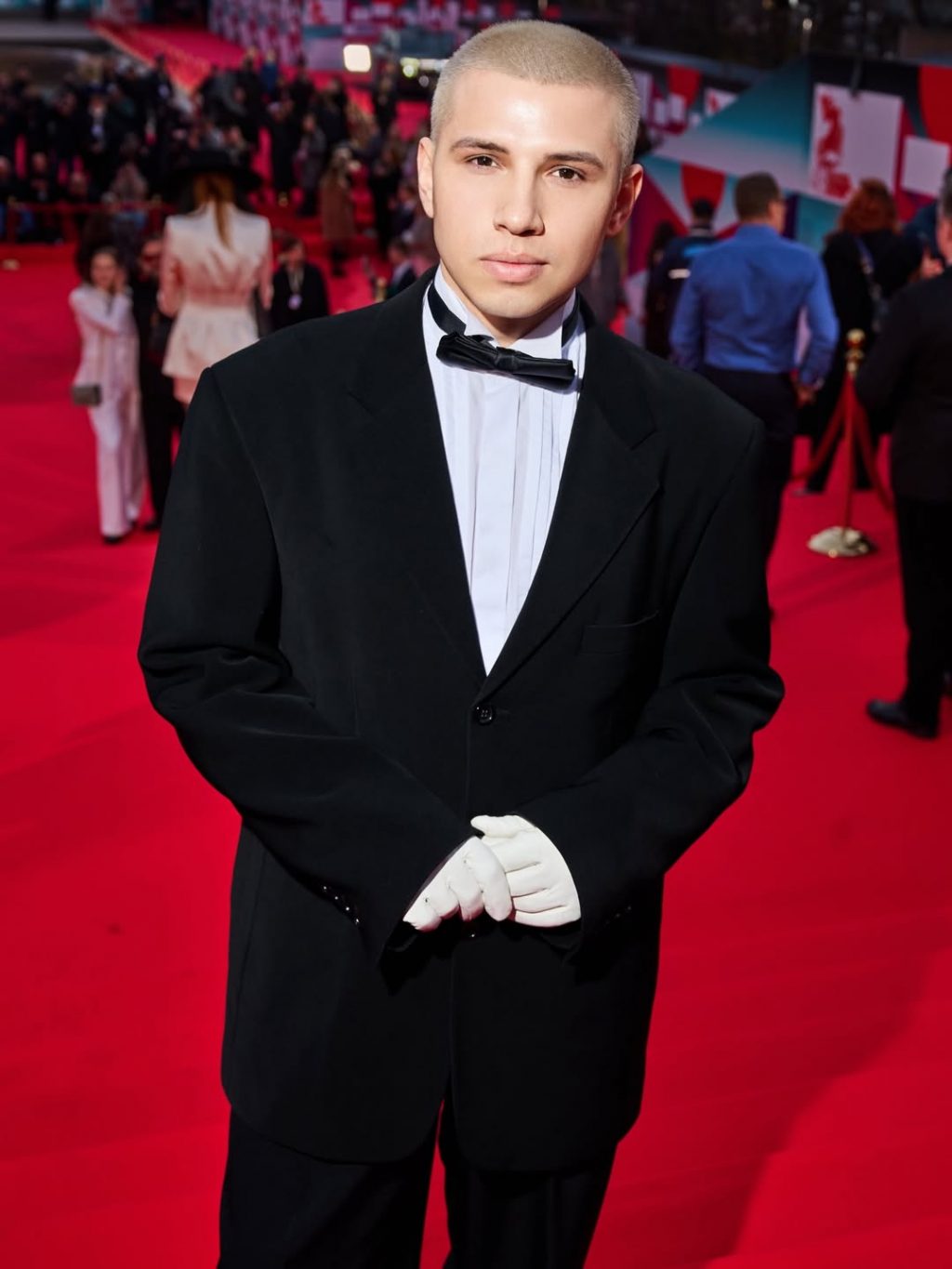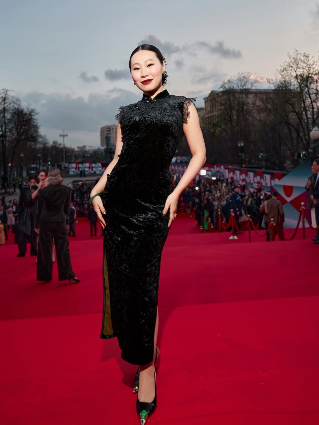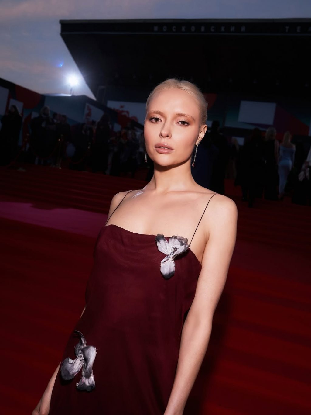 - Александра Киселёва продемонстрировала кутюрный подход в образе от Smirnova Couture — платье-колонна, расшитое стразами, в сочетании с перчатками и вуалью выглядело почти кинематографично.