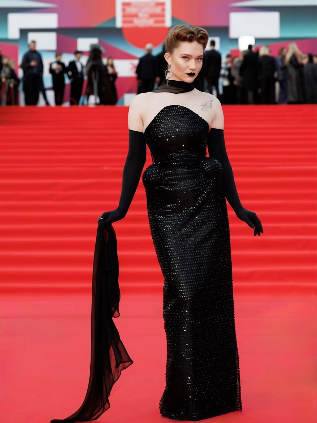 - Валерия Астапова выбрала фактурное чёрное платье из перьев — один из самых театральных выходов дорожки.