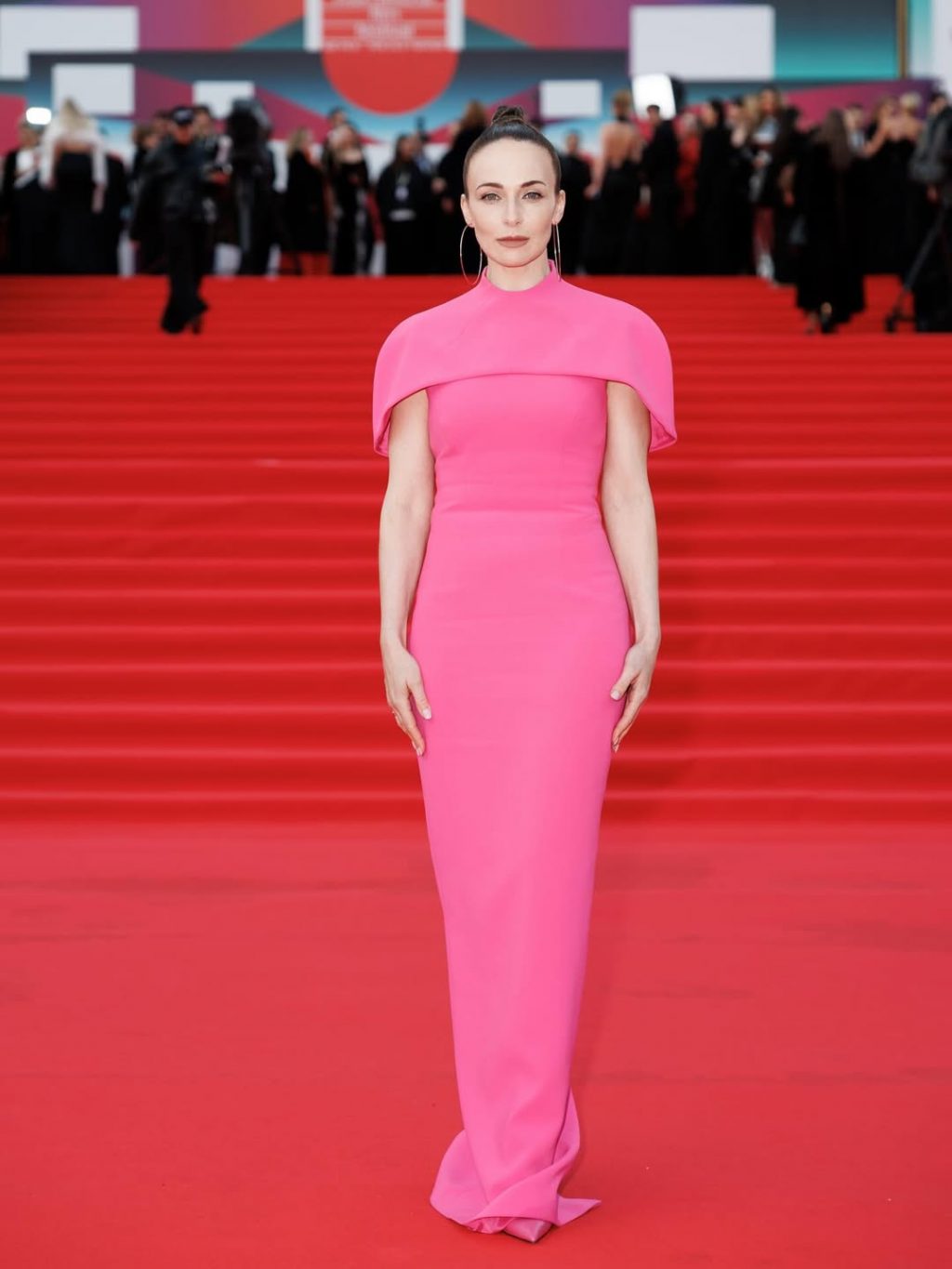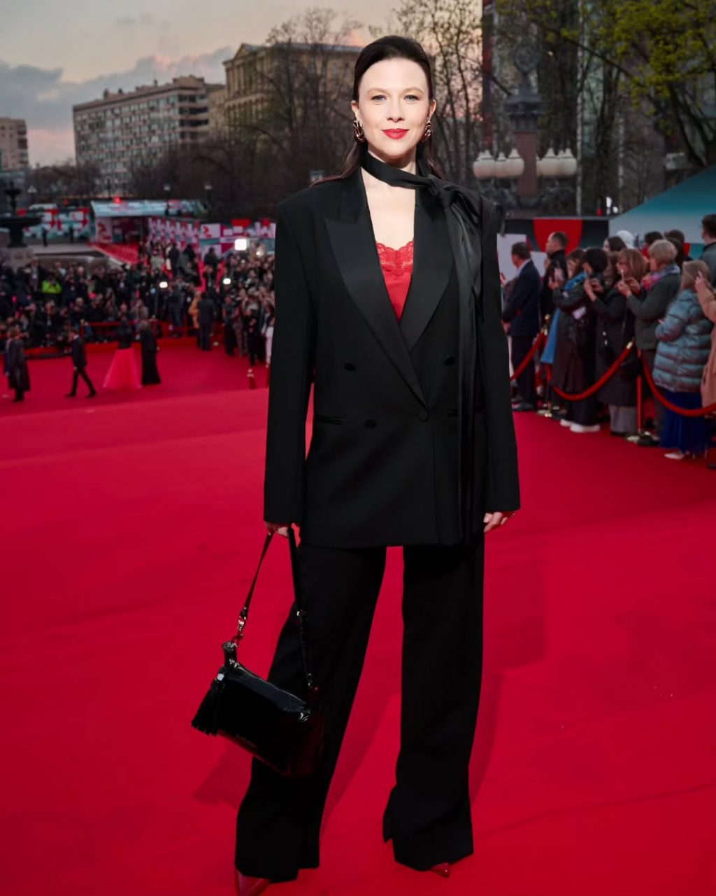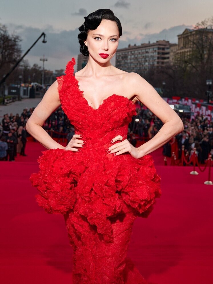 - Настасья Самбурская сделала ставку на драматичный красный — асимметричное платье с акцентным декольте и гладкая укладка усилили эффект.