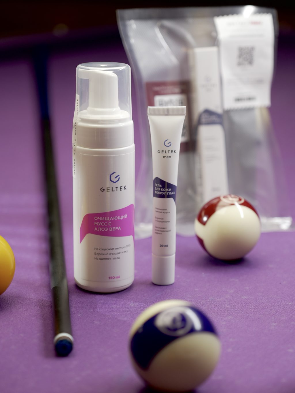На Маросейке коллаборация раскрывается через пространство: бильярдный зал на время проекта оформлен в фирменной эстетике Geltek. Здесь сценарий строится вокруг игры и лёгкой соревновательности: победители партий получают бестселлеры бренда — мужской гель для кожи вокруг глаз или очищающий мусс с алоэ вера. Первый освежает взгляд, уменьшая отёки и следы усталости благодаря кофеину и растительным экстрактам, второй — деликатно очищает кожу, не нарушая её барьер.