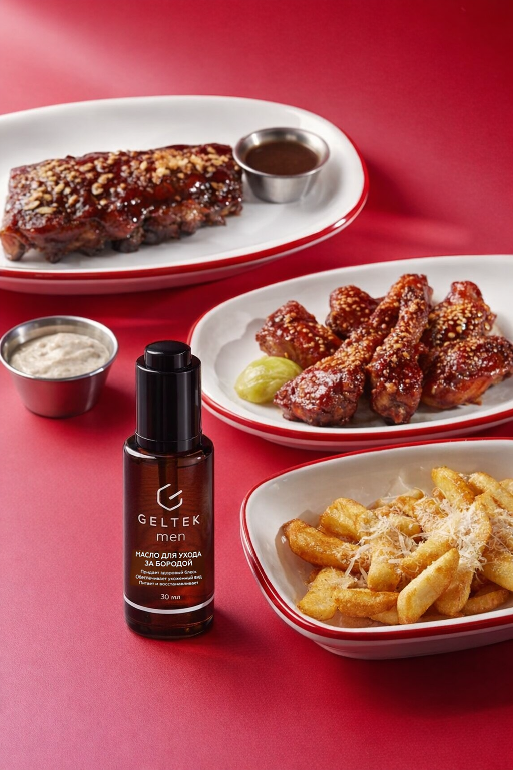 Центром притяжения становится специальное меню с ярко выраженным характером. В баре на Пятницкой гостям предлагают сет (1690 руб.), в котором комфортная гастрономия звучит с дерзкими акцентами: картофель фри с пармезаном и трюфельным соусом, сочные ребра в глазури из стаута и куриные крылья кимчи BBQ. К заказу — не просто гастрономическое удовольствие, а полноценный бонус: масло для бороды Geltek Men. Формула с маслами макадамии, авокадо, жожоба и арганы работает как ежедневный grooming-ритуал — питает, смягчает и придаёт аккуратный, ухоженный вид.