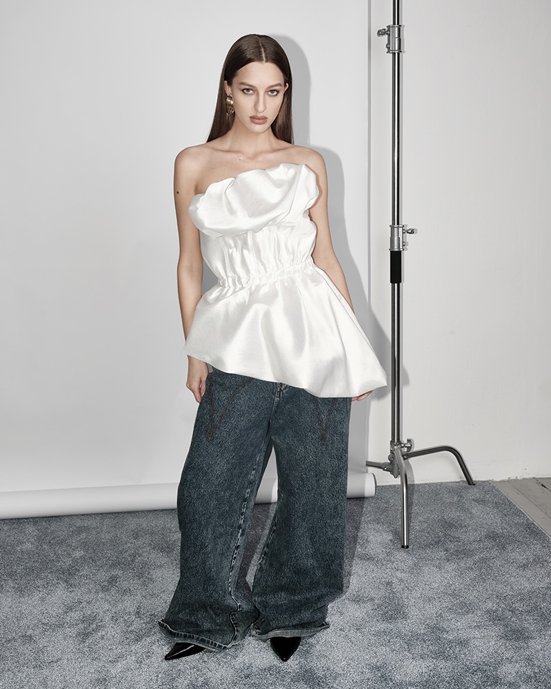 Топ с выразительным архитектурным кроем и объёмной линией низа подчёркивает талию и создаёт праздничный силуэт. Белый цвет делает образ нарядным, но не перегруженным.